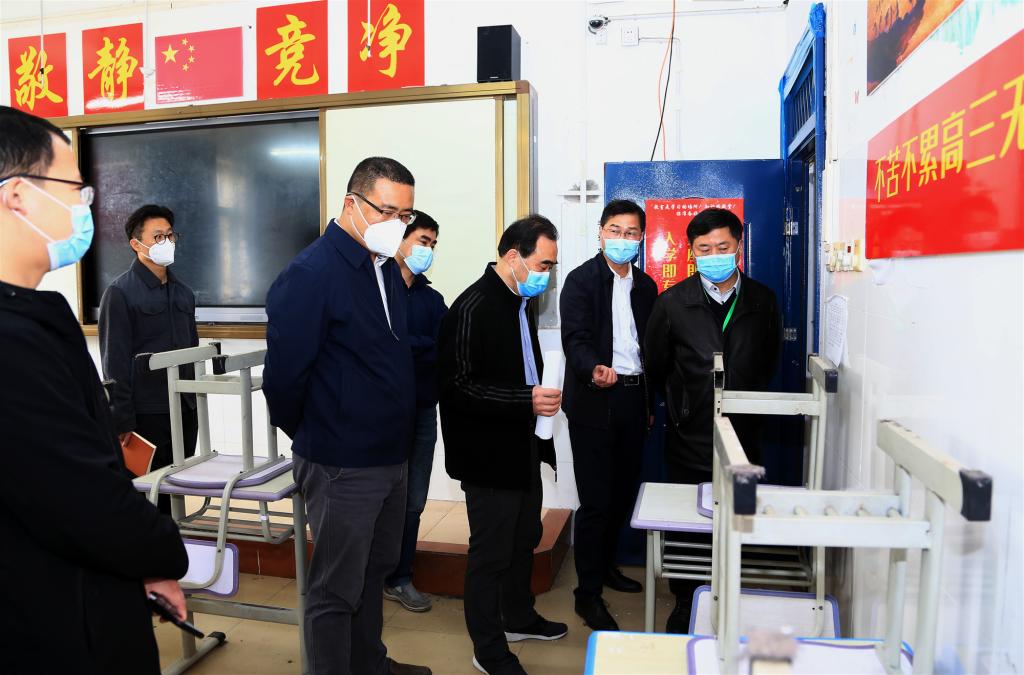 余其俊一行首先来到附属中学校门口,仔细查看了测温设备,体验测温系统的精准性,询问进出校园分流通道的设置方案。接着实地考察了校医室、隔离观察室以及高三、初三毕业班教室等重点部位,详细询问了防控物资储备、开学准备、校园管控、线上教学、学生就餐预案等情况。