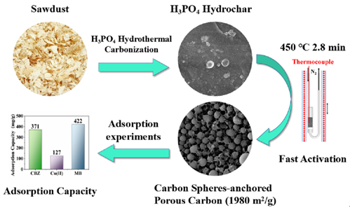 研究团队以来源广泛的木屑为碳源,采用磷酸水热联合快速活化的方法,在快速升温至450 ℃的较低温过程中实现前体的快速活化,整个活化升温过程仅有2.8分钟,无需额外的活化时间,大大减少了活化过程的能源消耗。获得的碳材料比表面积高达1980 m2/g。研究发现制备的碳材料有较为丰富的微/介孔结构,且碳基底上负载有大量纳米碳球,其与碳层编织在一起,形成三维多孔网络结构。该碳材料对多种污染物均表现出了良好的吸附性能,具有良好的应用前景。