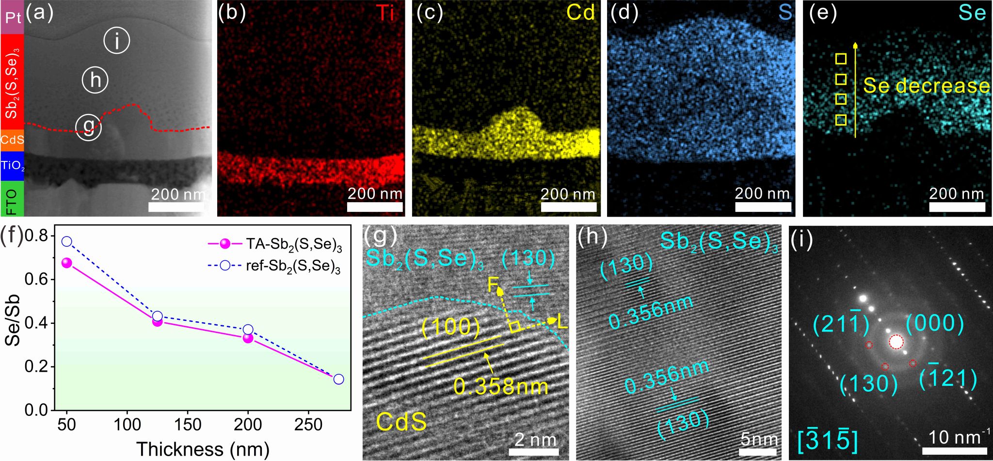 图1.硒硫化锑半导体薄膜相关特性表征及Se元素浓度梯度分布