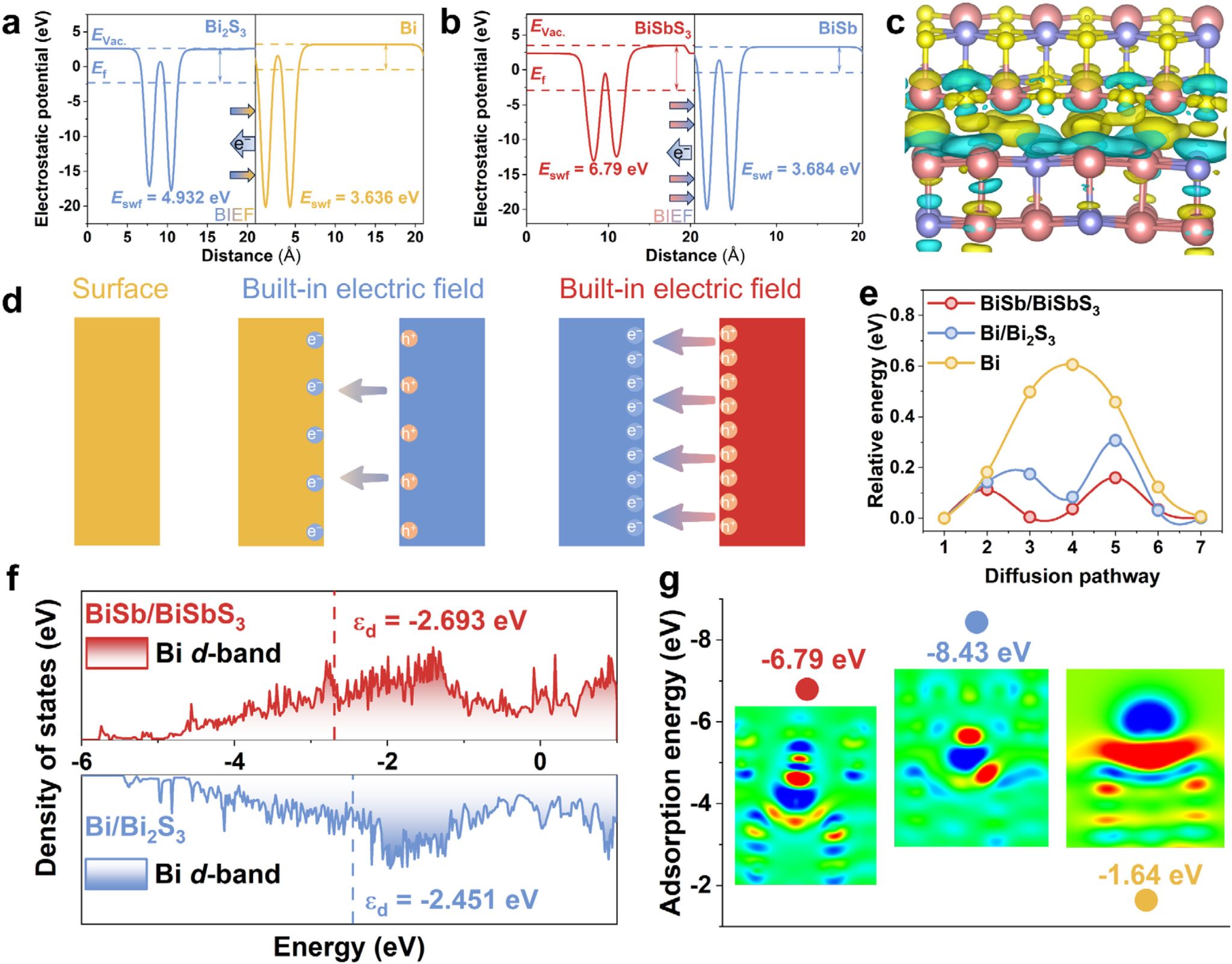 针对上述挑战,研究团队提出了“合金化调控异质结界面”的创新策略,通过两步水热-碳化还原法成功构建了BiSb/BiSbS3微米棒簇状异质结负极材料。密度泛函理论(DFT)计算表明,锑(Sb)与铋(Bi)形成合金后,有效调控了异质结的表面功函数,增强了界面内建电场,实现了钠离子吸附与扩散动力学的精准平衡。实验结果显示,该BiSb/BiSbS3电极表现出卓越的电化学性能:在20 A g-1的超高电流密度下,可逆比容量仍达520.9 mAh g-1,且首次库仑效率高达96.64%。XPS深度剖析和TOF-SIMS证实了SEI层呈现“外层有机-内层无机”的稳定结构,NaF和Na2O共同构建了一个具有高机械强度、快速Na+传导“电极外衣”,有效的抑制了电极的体积膨胀,循环500次后体积膨胀率仅为理论值的23%。将该负极与Na3V2(PO4)3正极组装成全电池后,在15 C的超高倍率下比容量达465.5 mAh g-1,能量密度高达221.1 Wh kg-1,展现出优异的实际应用潜力。