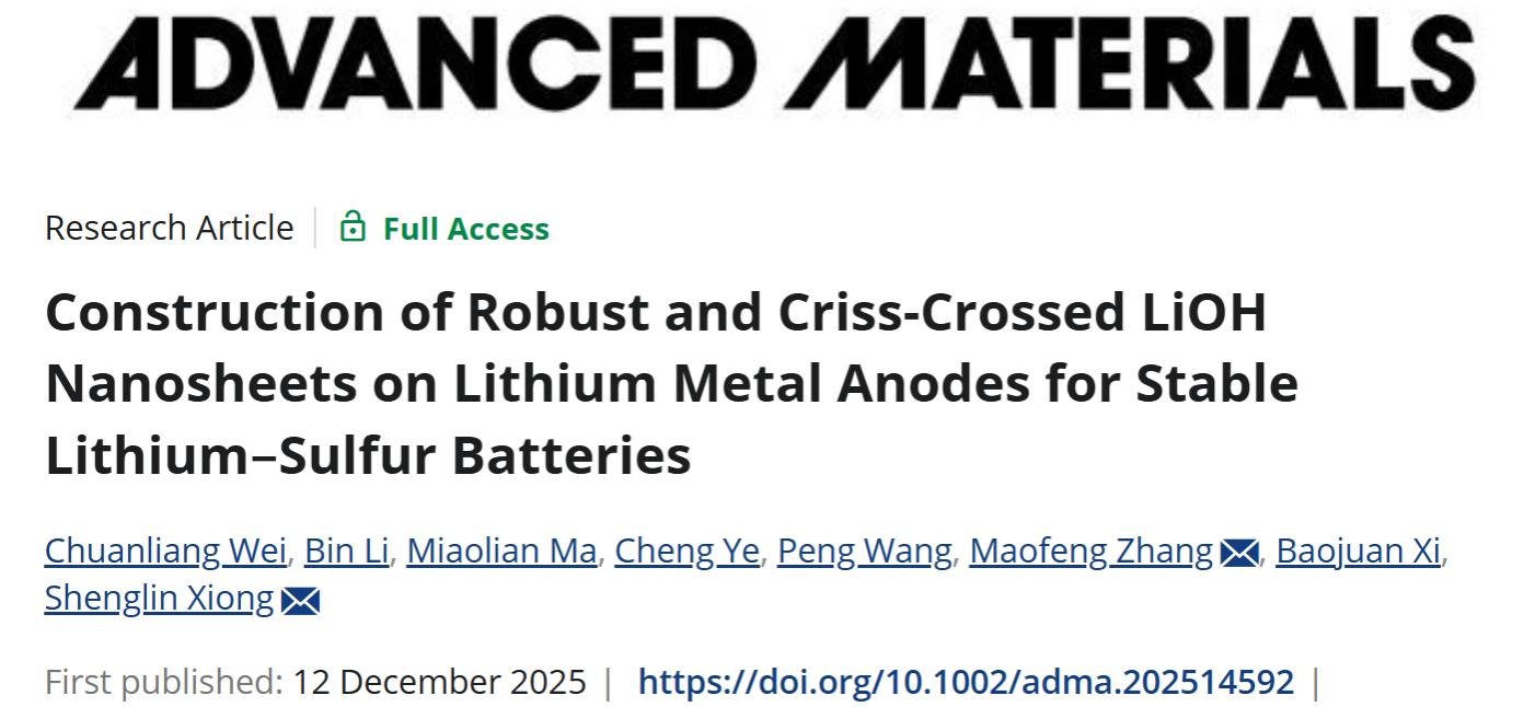 近日,化学与化工学院张茂峰教授团队在锂硫电池化学储能领域取得新进展。相关成果以题“Construction of Robust and Criss-Crossed LiOH Nanosheets on Lithium Metal Anodes for Stable Lithium–Sulfur Batteries”在材料领域国际知名期刊《Advanced Materials》上发表。新进教师魏传亮博士为论文第一作者,张茂峰教授和山东大学熊胜林教授(我校兼职教授)为论文共同通讯作者。合肥工业大学为论文第一通讯单位。