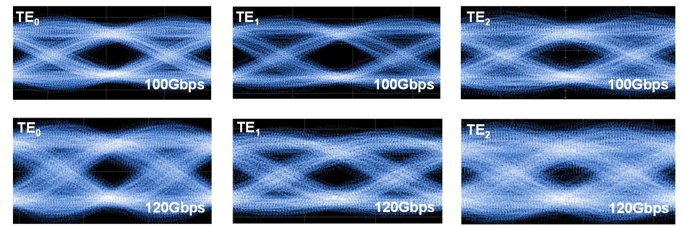 为进一步验证系统级综合性能,团队在同一芯片上集成了高速电光调制器。实验结果表明,该集成系统在实现多模信号传输的同时,单个通道的数据调制速率高达120 Gbps。这充分证明了该技术方案不仅能实现器件高密度集成,还能保持铌酸锂材料本身的高速电光调制优势,标志着薄膜铌酸锂光子集成技术向“更高密度、更小尺寸、更强功能”迈出了关键一步,为未来研制超大容量、超高速率的光通信与光计算芯片奠定了核心技术基础。