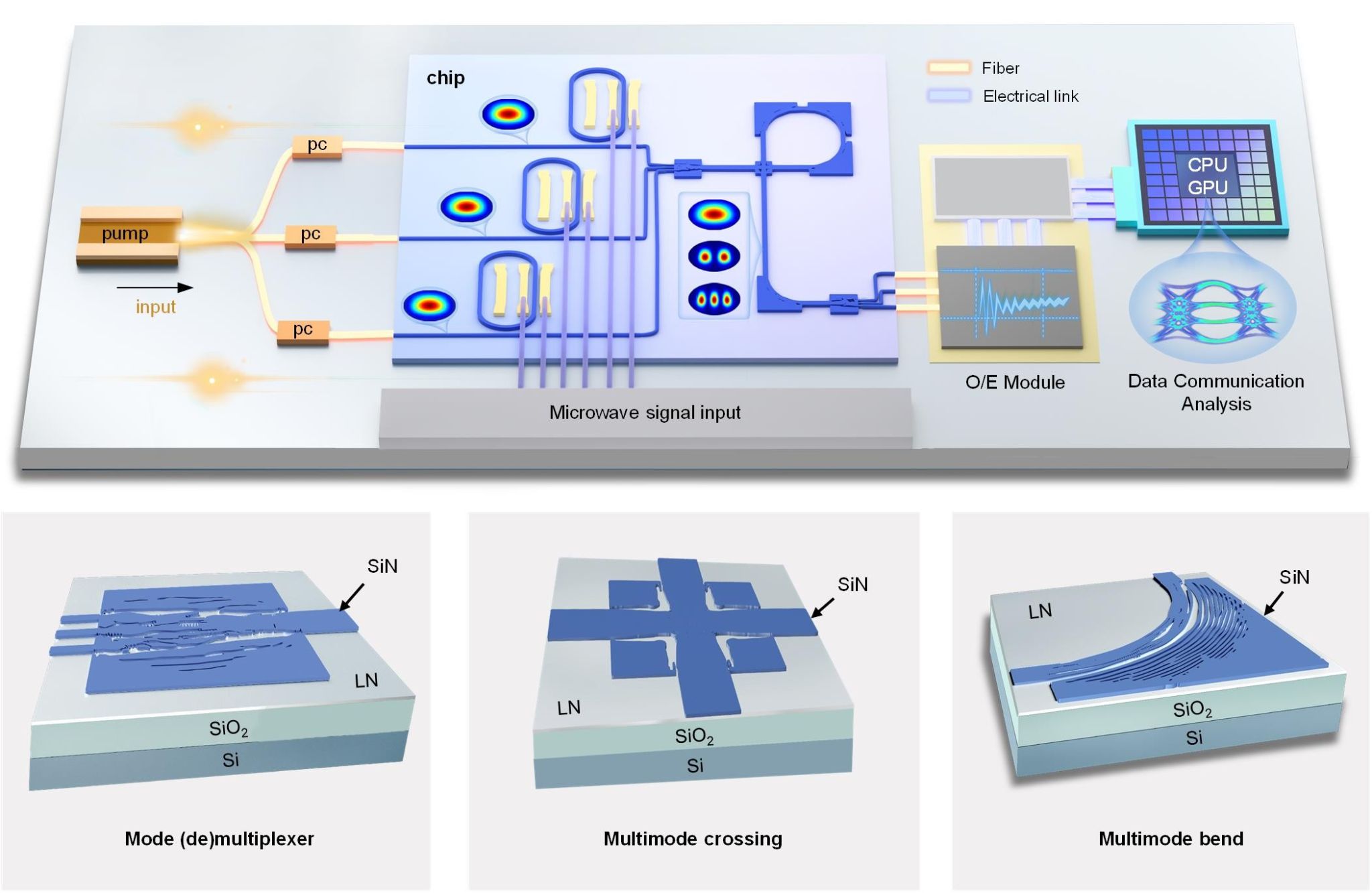 针对这一难题,研究团队采用氮化硅-薄膜铌酸锂异质集成方法,借助氮化硅材料低光学损耗、各向同性和成熟工艺优势,将光子学逆向设计理念成功引入薄膜铌酸锂器件研发。该方法通过智能算法在设定区域内自由“搜寻”最优结构,从而打破传统波导设计的物理直觉限制,实现微观尺度上对光场的精准操控。凭借这一强大工具,研究团队成功设计并制备出一系列超紧凑、高性能的基础光子器件:模式复用/解复用器尺寸仅为19×25 μm²,多模波导交叉尺寸低至15×15 μm²,多模波导弯曲半径缩减至30 μm。这些器件尺寸均显著超越了传统设计方法的极限,有望将薄膜铌酸锂无源器件的面内集成密度提升一个数量级,并极大地优化光路设计自由度。研究团队将这些“微纳积木”高效组合,在一片仅0.06 mm2的微型芯片上集成了超过10个波导元件,构建出复杂的多模光子电路并应用于大容量数据通信演示,展现出高密度集成的巨大潜力。