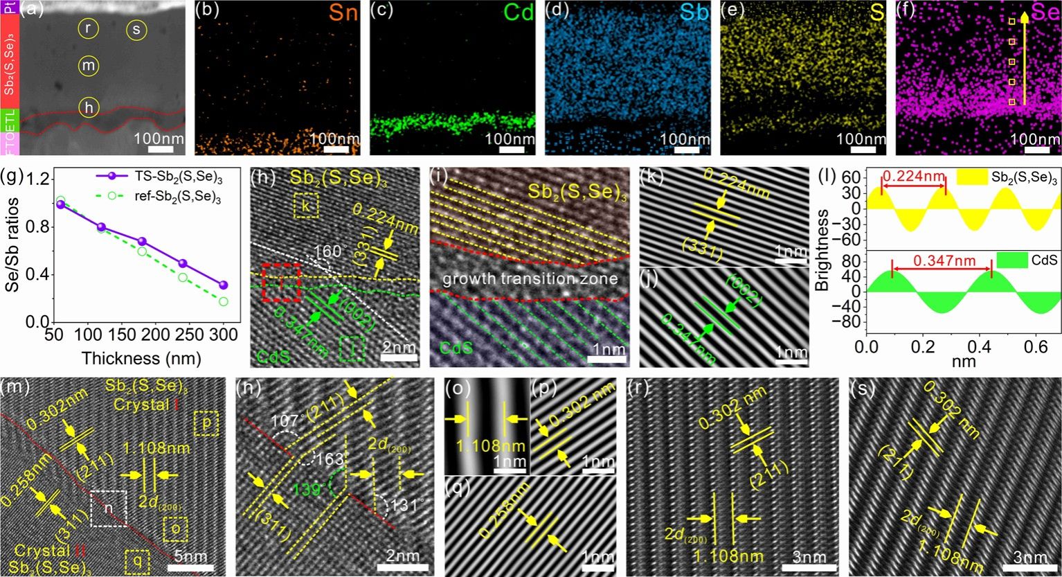 图2.Sb2(S,Se)3薄膜的元素分布、微观结构及Se/Sb原子比变化趋势