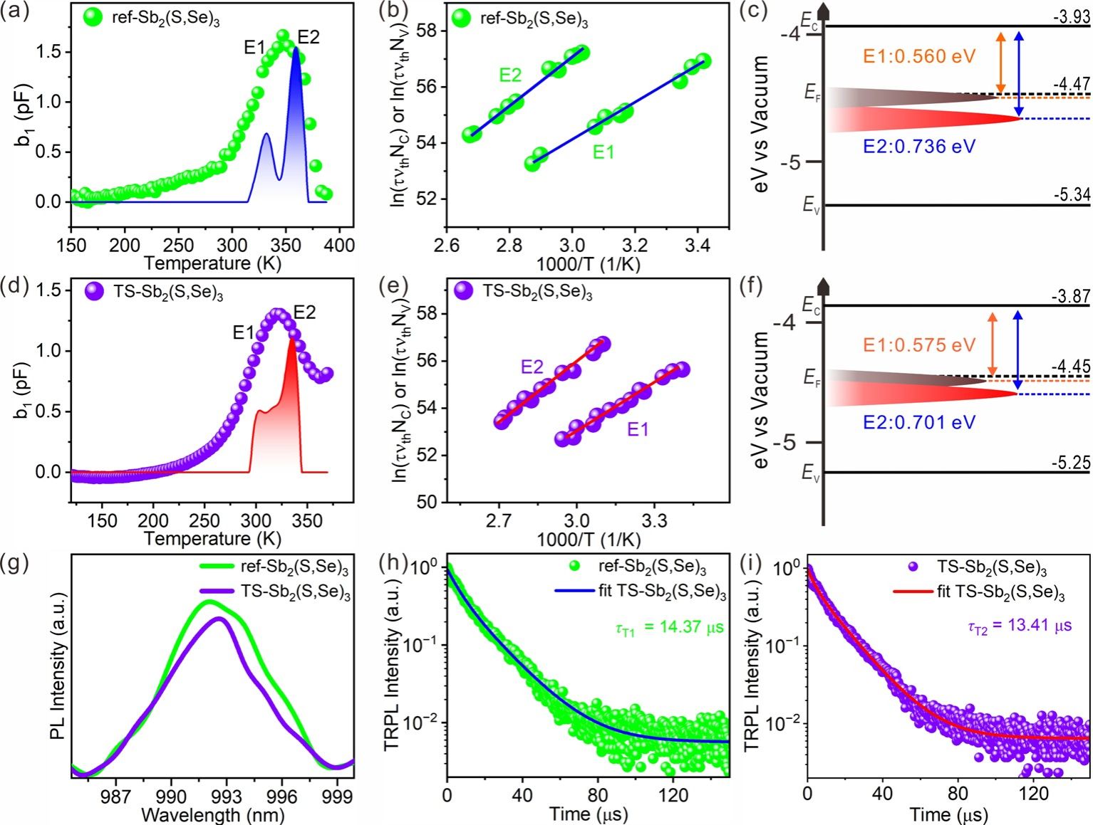 图3.Sb2(S,Se)3薄膜的DLTS缺陷分析(种类与能级)及相关光谱表征