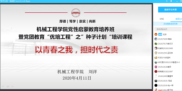 4月11日晚,机械工程学院党团教育“优培工程”之“种子计划”党性启蒙教育培养班通过视频会议系统线上开班,学院党委相关负责同志、学生思政辅导员、培养班学员共70余人参加了活动。
