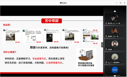 8月10日下午,化学与化工学院化工原理课程教学团队邀请学院2017届化学工程与工艺专业毕业生、浙江大学在读博士生陈富强进行了“学长朋辈教育之就业求学经验分享会”,会议采取线上交流的方式进行,化学工程与工艺专业2017级、2018级有志考研的30余名同学及年级辅导员参加了交流会。