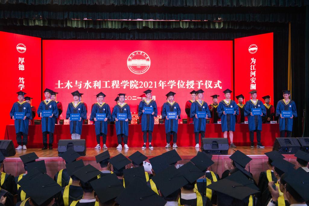 仪式上,学院学位委员会主席、常务副院长王静峰教授宣读《关于授予土木与水利工程工程学院2021年毕业生学位的决定》,授予王志龙、于士钊、赵文轩等518名本科毕业生工学学士学位,授予李金超等3名同学学术博士学位,授予江鹏等100名同学全日制学术硕士学位,授予汤子祥等126名同学全日制专业硕士学位,授予王凯军等8名同学非全日制专业硕士学位。仪式为全体学位获得者颁发学位证书、扶正流苏。