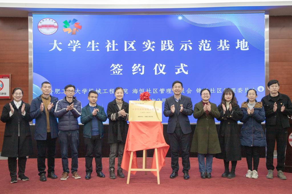 3月24日上午,机械工程学院与经开区海恒社区、锦绣社区共建“大学生社区实践示范基地”签约揭牌仪式在合肥工业大学翡翠湖校区科教楼第四会议室举行。校团委书记武国剑、合肥经济技术开发区团工委书记黄丽侠等共同见证签约。