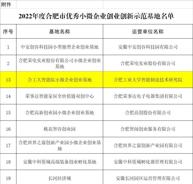 近日,合肥市经信局公布了2022年度合肥市优秀小微企业创业创新示范基地名单,我校智能院成功入选,连续两年获评优秀。