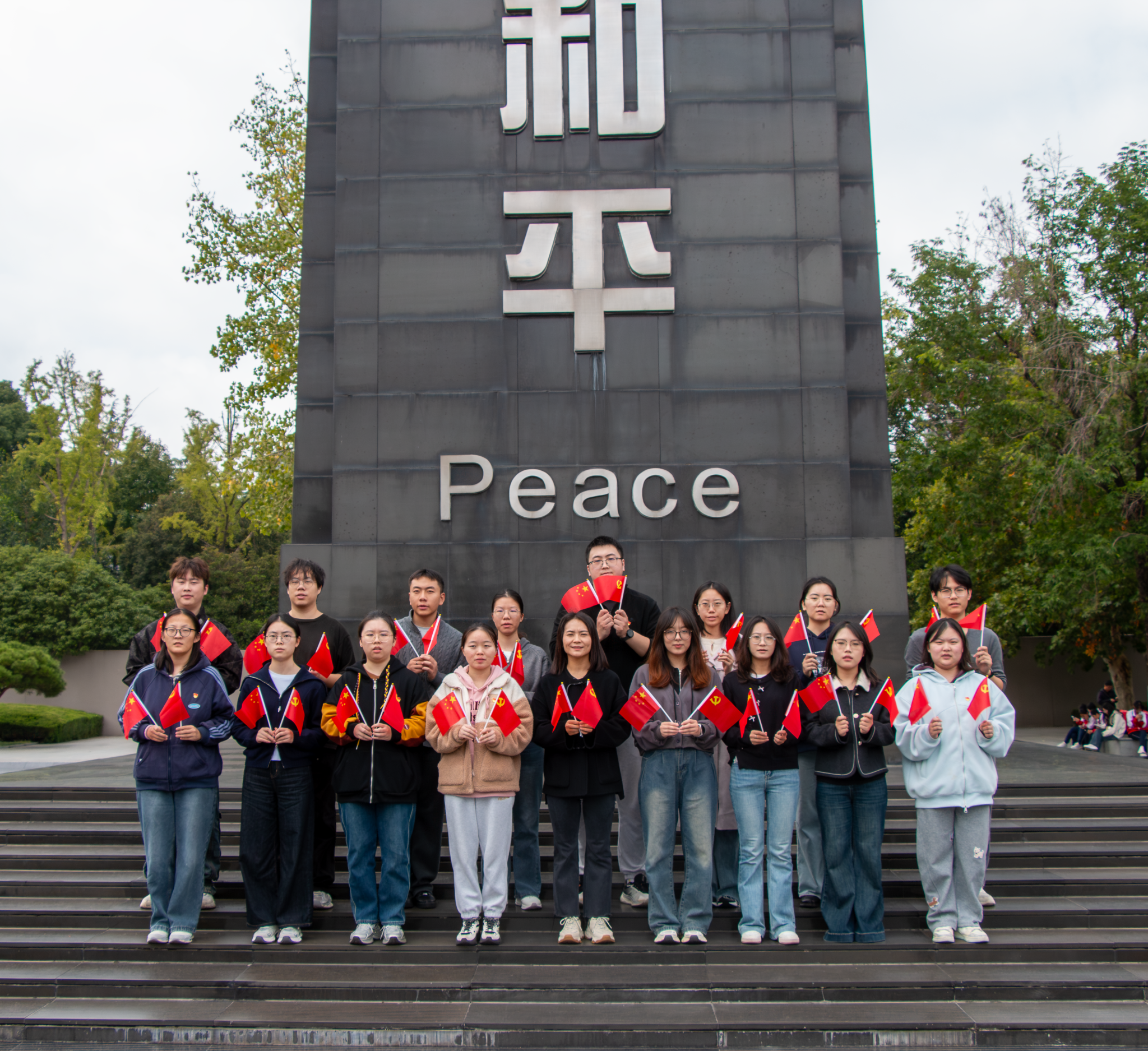 参观的最后,支部成员在和平广场前整齐列队,和平雕塑以舒展的姿态诠释着和平的珍贵,雕塑无声,此刻却震耳欲聋。面对这象征希望与愿景的雕塑,大家眼神坚定、神情肃穆,齐声喊出“铭记历史,珍爱和平”的铿锵誓言,这是对遇难同胞的告慰,更是对守护和平的庄严承诺。