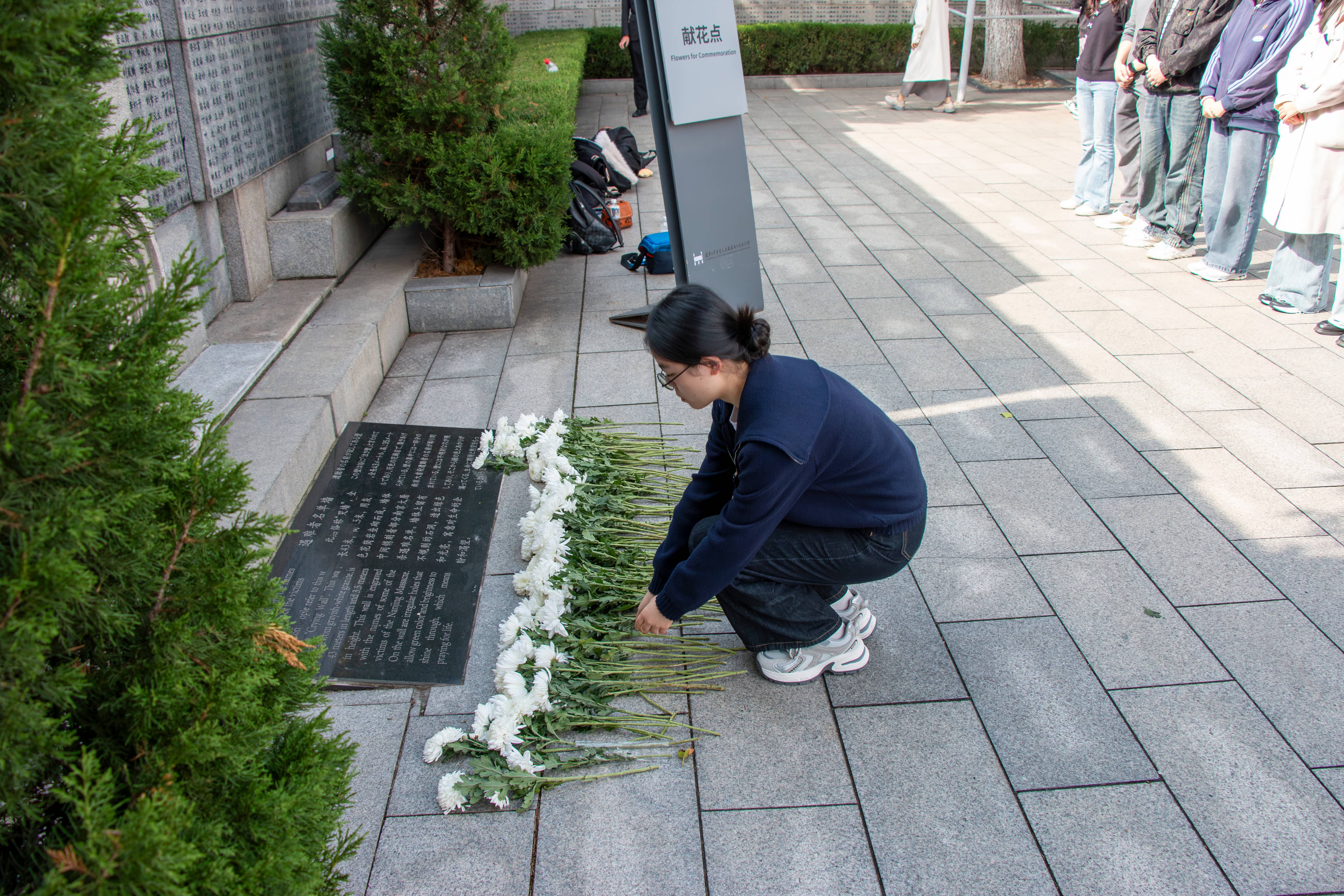 走出展厅,全体成员在指定区域肃立成行,举行庄重的默哀仪式。大家身姿挺拔、垂首静立,以此向南京大屠杀遇难同胞致以最深切的哀悼,现场肃穆的氛围,让每一位成员都更真切地体会到历史的沉重。默哀仪式后,大家有序前往献花点,怀着无比沉痛的心情依次敬献鲜花,朵朵白花承载着对遇难同胞的缅怀与敬意。
