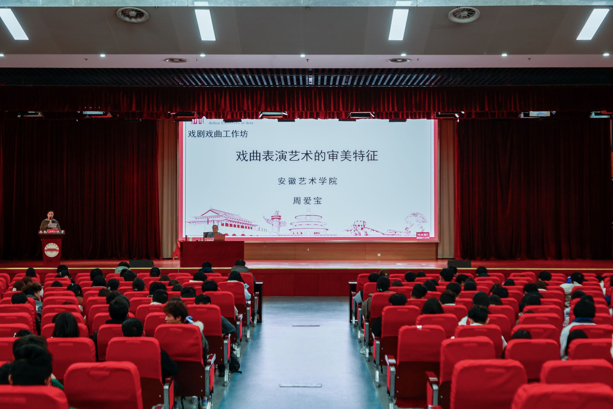 11月19日,“戏曲表演艺术的审美特征”专题讲座在翡翠湖校区科教楼A座二楼报告厅举行。国家一级演员、安徽艺术学院原教务处处长兼戏剧学院院长周爱宝教授应邀主讲,为现场近600名师生带来了一场兼具专业性与观赏性的文化盛宴。