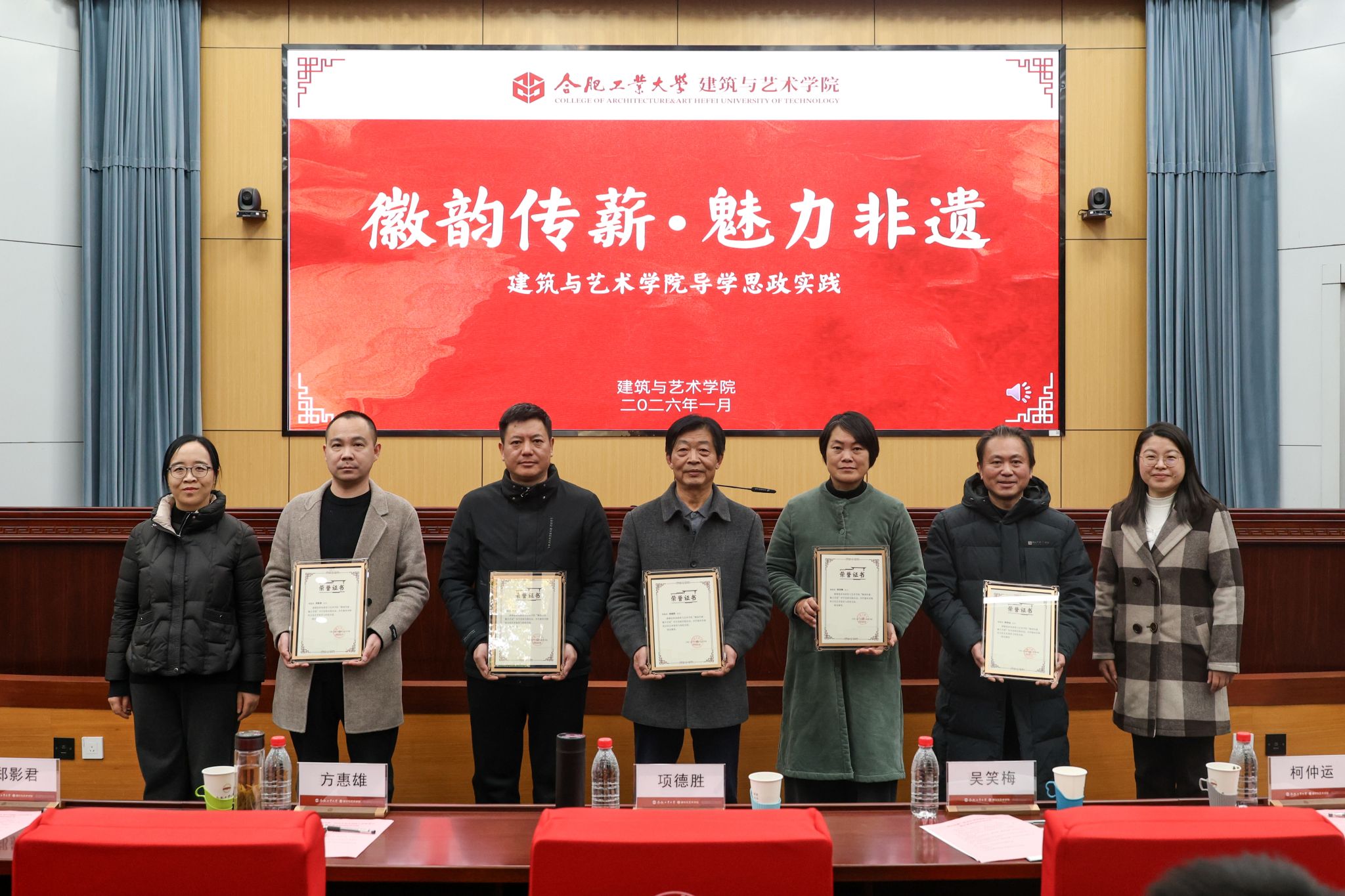 工作室成立仪式上,建筑与艺术学院副院长、工作室负责人王薇介绍了“徽韵传薪”研究生导学思政工作室的建设理念、建设目标和建设方案。教务处副处长张毅、校团委副书记刘芳芳为项德胜、柯仲运、郑影君、吴笑梅、方惠雄等5位非遗传承人颁发“非遗进校园活动”证书。与会领导老师共同启动了“徽韵传薪”研究生导学思政工作室。仪式由建筑与仪式学院党委书记孙建海主持。