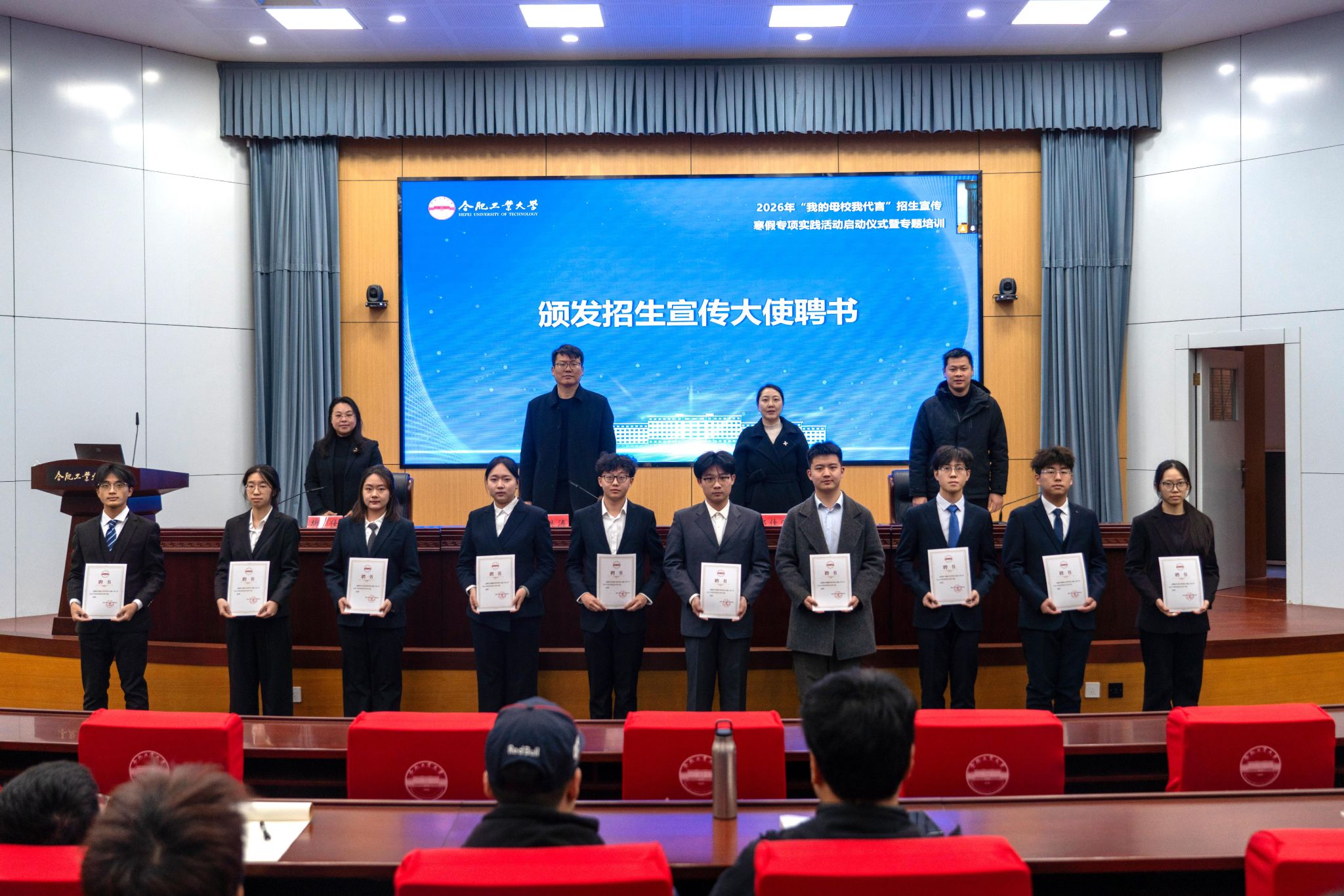 启动仪式上,招生与就业处处长李洪涛作动员讲话。他表示,此次活动规模空前,共有两千余名学子积极报名,希望宣传大使们在宣传工大、履职尽责的同时,也要注重安全,确保活动平稳有序完成。党委学生工作部副部长邹佳莹宣读了《合肥工业大学2026年“我的母校我代言”招生宣传寒假专项实践活动方案》。随后,参会领导为“招生宣传大使”代表颁发聘书,正式明确两千余名学子的宣传使命。