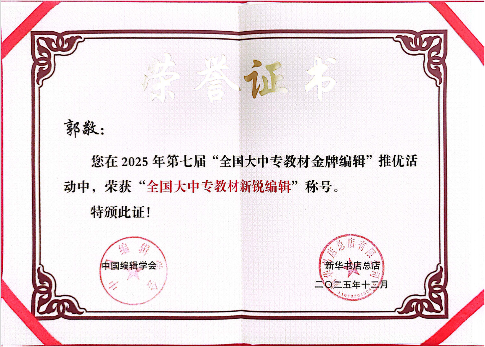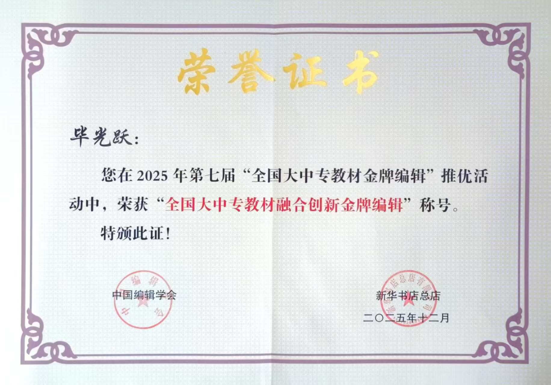 1月7日,2026高等教育教材行业合作大会在北京举办,会上公布了由中国编辑学会和新华书店总店主办的第七届“全国大中专教材金牌编辑”推优活动的入选名单,我校出版社毕光跃同志荣获第七届“全国大中专教材融合创新金牌编辑”称号,郭敬同志荣获“全国大中专教材新锐编辑”称号。