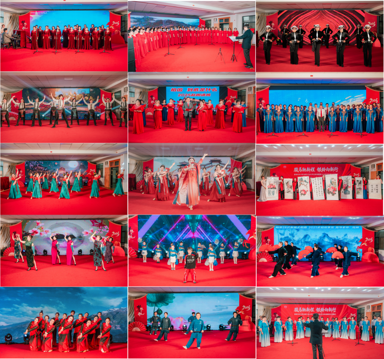迎春展演现场,开场舞蹈《大唐夜宴》气势恢宏,瞬间点燃全场热烈氛围。充满异域风情的非洲鼓表演《重返17岁》以明快的节奏、迸发的活力,传递出对青春岁月的深情回望。合唱《萱草花》《珊瑚颂》《听妈妈讲那过去的故事》旋律悠扬、情感真挚,以饱含深情的歌声,诉说着对祖国的挚爱、对往昔的眷恋与对生活的感恩。舞台秀《时代节奏》与《江南烟雨》风格各具特色,展现现代时尚的动感活力,演绎江南水乡的温婉雅致,彰显了自信从容、优雅大方的精神风貌。国画班《2025精彩书画》展现了翰墨丹青中的艺术风采与晚年雅趣。太极拳班《28式太极扇》刚柔并济、形神兼备,养生班《养生杖》动作舒缓、气韵绵长。舞蹈《再现芳华》《流芳》舞姿优美、意境深远,舞出了不忘初心、青春永驻的昂扬姿态。工大幼儿园小朋友《快乐小星星》天真烂漫、活泼可爱,稚嫩的身影与纯真的笑容为现场增添了盎然童趣。朗诵《祖国到底是什么》声情并茂、铿锵有力,激情抒发了对祖国母亲的无限热爱与深深眷恋,引起全场强烈共鸣。金晚霞合唱团雄浑壮阔的《向往西藏》压轴登场,嘹亮歌声余韵悠长,为汇演画上了圆满句号。