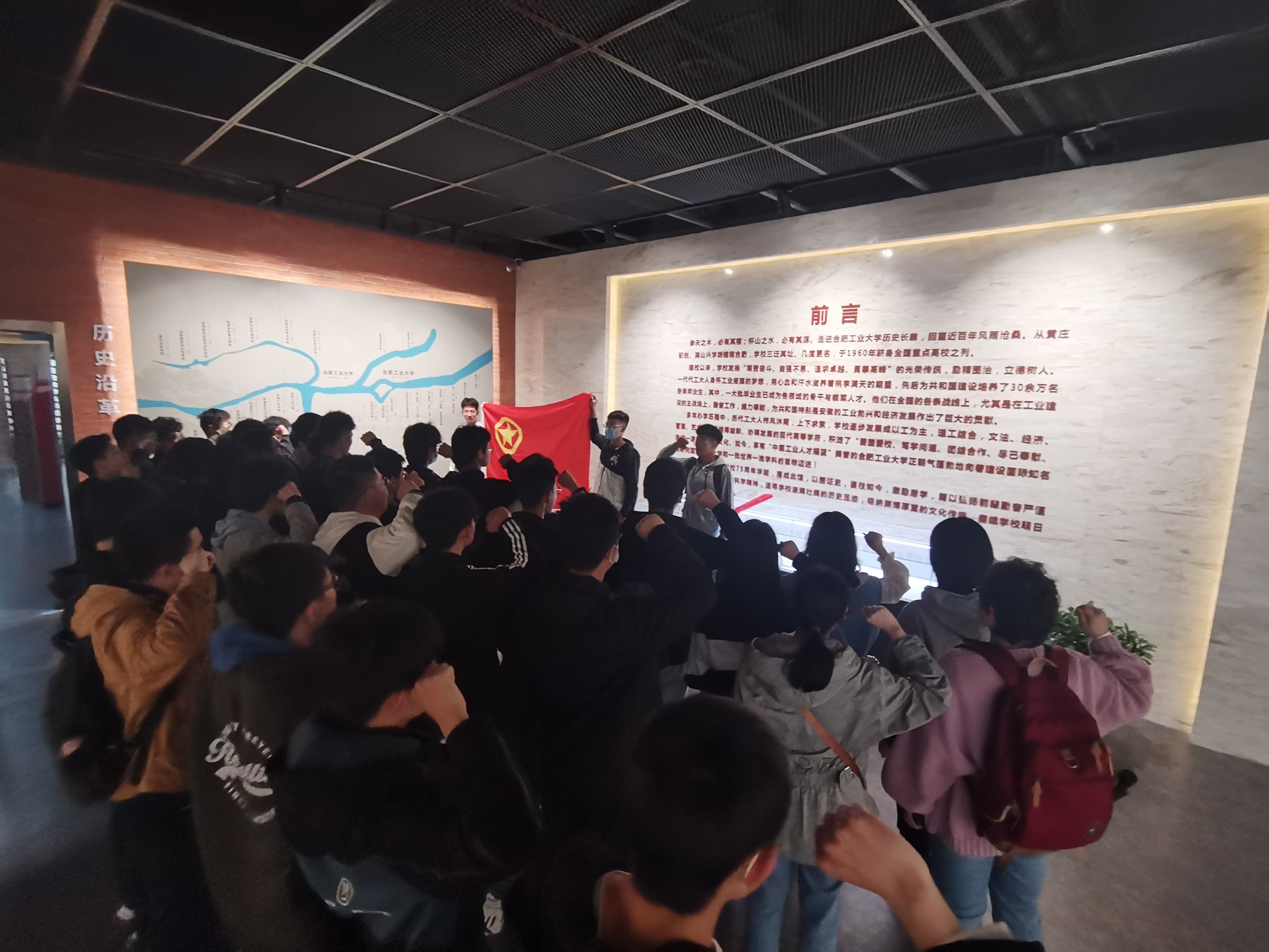 在讲解员的带领下,同学们走进校史馆,穿过院士长廊,依次参观了校史馆的事业初创、跃升重点、改革前行、创新发展、硕果累累和校友风采等六个展厅。回顾了学校76年来披荆斩棘、工业报国的奋斗历程,感受了一代代工大人“艰苦奋斗、自强不息、追求卓越、勇攀高峰”的光荣传统。展厅中珍贵的实物史料、文字图片、多媒体影像等生动呈现了学校悠久的办学历史和厚重的文化内涵,让全体同学们肃然起敬,驻足思考,赞叹感概。在校史馆中,全体同学面向团旗,重温入团誓词。