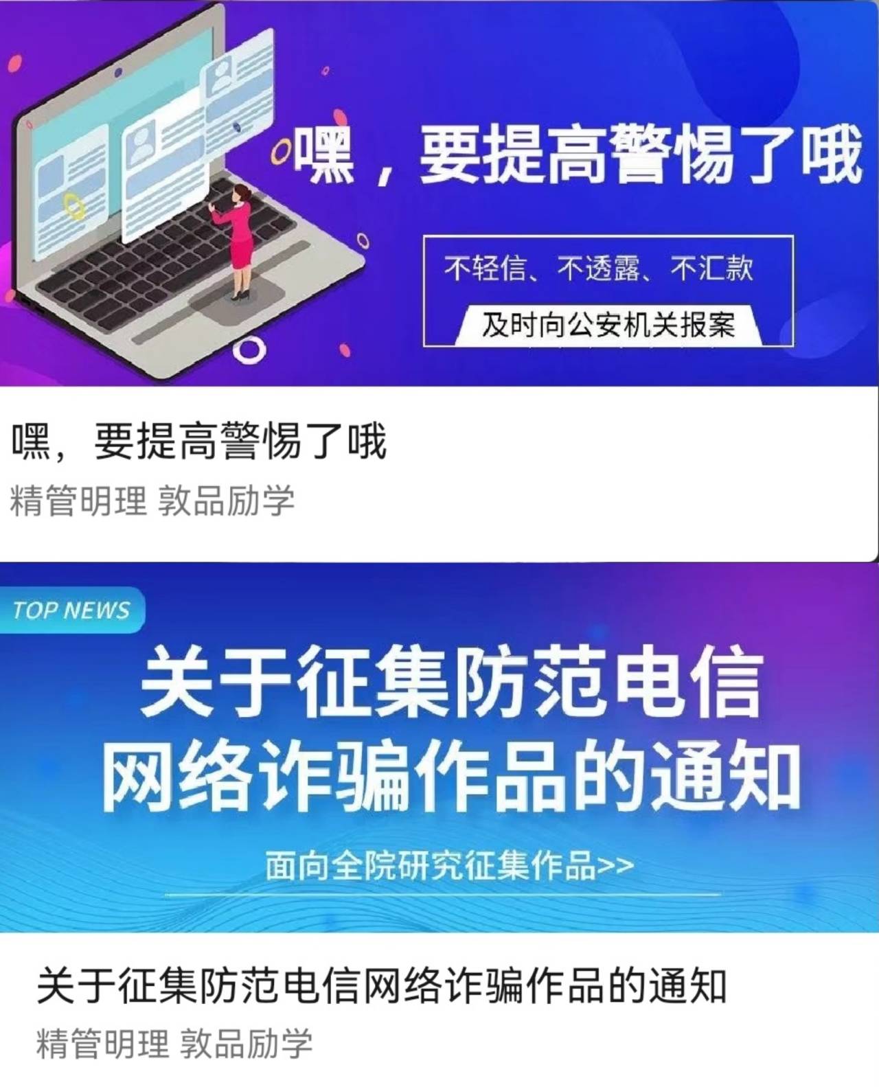 此外,学院研究生开展防范电信网络诈骗作品征集活动,全员签订《防范电信网络诈骗承诺书》,学院以管院青年说网络平台加强宣传教育,学生全员下载安装国家反诈中心app。
