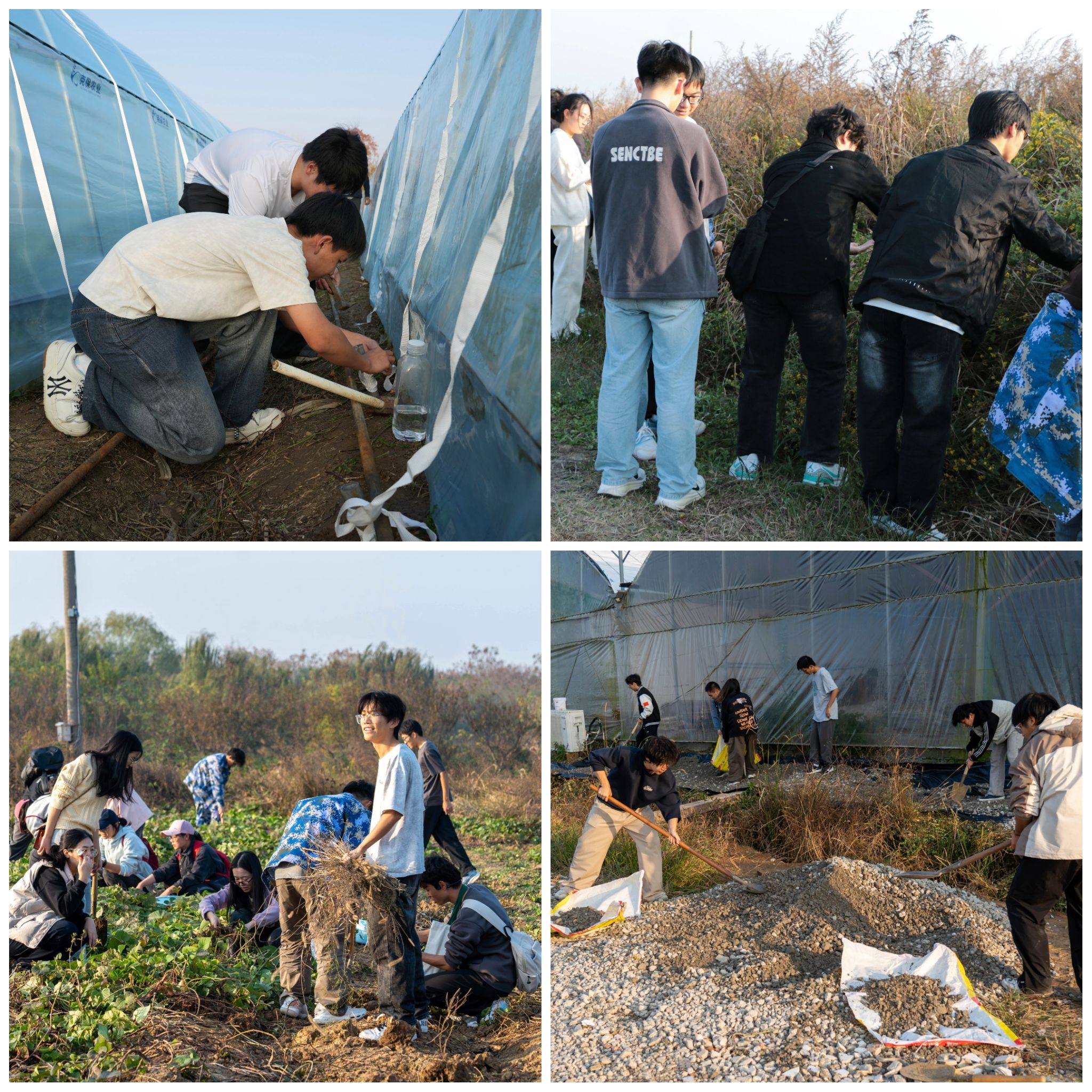 此次劳动实践共有五个实践项目,学生以班级为单位,在农场师傅和班主任的带领下,在农场的不同区域开展劳动实践。食科25-1班和食科25-2班躬身于田埂地头播种蚕豆、翻挖红薯;药学25-1班、制药25-1班和制药25-2班穿梭于田间,采摘野菊花;食安25-1班和食安25-2班跟随着农场师傅,帮助完成安装固定蔬菜大棚;生物技25-1班和生工25-1班在农场师傅的指导下,为烧饭大棚边水沟一侧铺上防潮布和石子。劳动现场气氛欢乐融洽,师傅的讲解声、同学的欢笑声交织,三三两两的学生组团分工,在合作中学习劳动的知识,体验劳动的快乐。