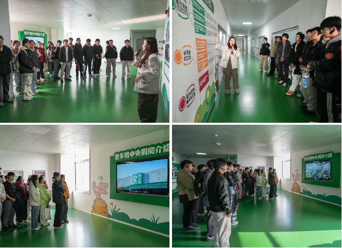老乡鸡中央厨房人力行政科负责人李蕾钦详细讲解了企业“从养殖到餐桌”的全产业链布局,以及“品质第一,顾客至上,员工为大”的经营理念。师生们先后参观企业文化长廊与现代化中央厨房,透过玻璃幕墙近距离观摩全自动化生产流程,每一个环节都让大家真切感受到食品工业的干净卫生和标准化管控的重要性。在物流中心内,全国门店销售热力图、生产线运转效率、冷链配送轨迹等实时数据清晰呈现,直观展现了科技对传统餐饮产业的赋能价值。