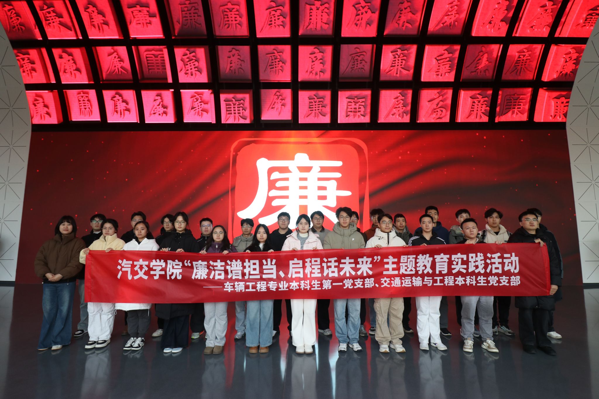 为深入推进廉洁文化建设,切实强化青年党员廉洁自律意识,筑牢拒腐防变的思想根基,引导青年学子扣好人生“第一粒扣子”。1月5日下午,汽交学院车辆工程专业本科生第一党支部、交通运输与工程本科生党支部联合开展“廉洁谱担当、启程话未来”主题教育实践活动,组织支部党员赴安徽省党风廉政教育馆参观学习,重温入党誓词。