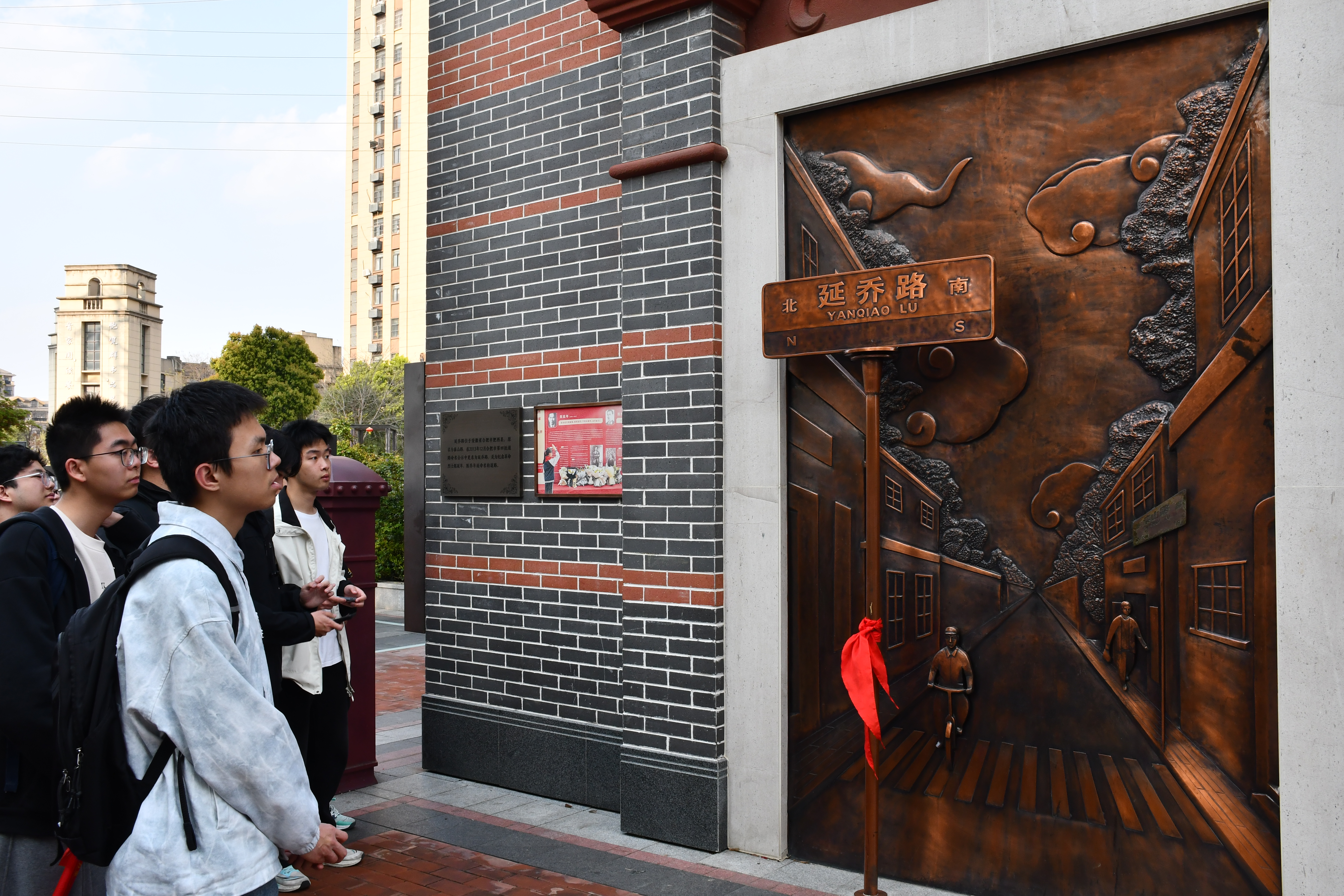在学院“明理宣讲团”成员的引导下,同学们首先参观了“穿越之门”。该门以上海石库门建筑风格为设计蓝本,象征陈延年、陈乔年兄弟投身革命事业的初心起点。随后,师生们依次观摩了《时光流影》艺术装置、《岁月记忆》浮雕及《延乔版画纪念墙》等景观,一系列生动的艺术作品再现了烈士的成长轨迹与革命精神。