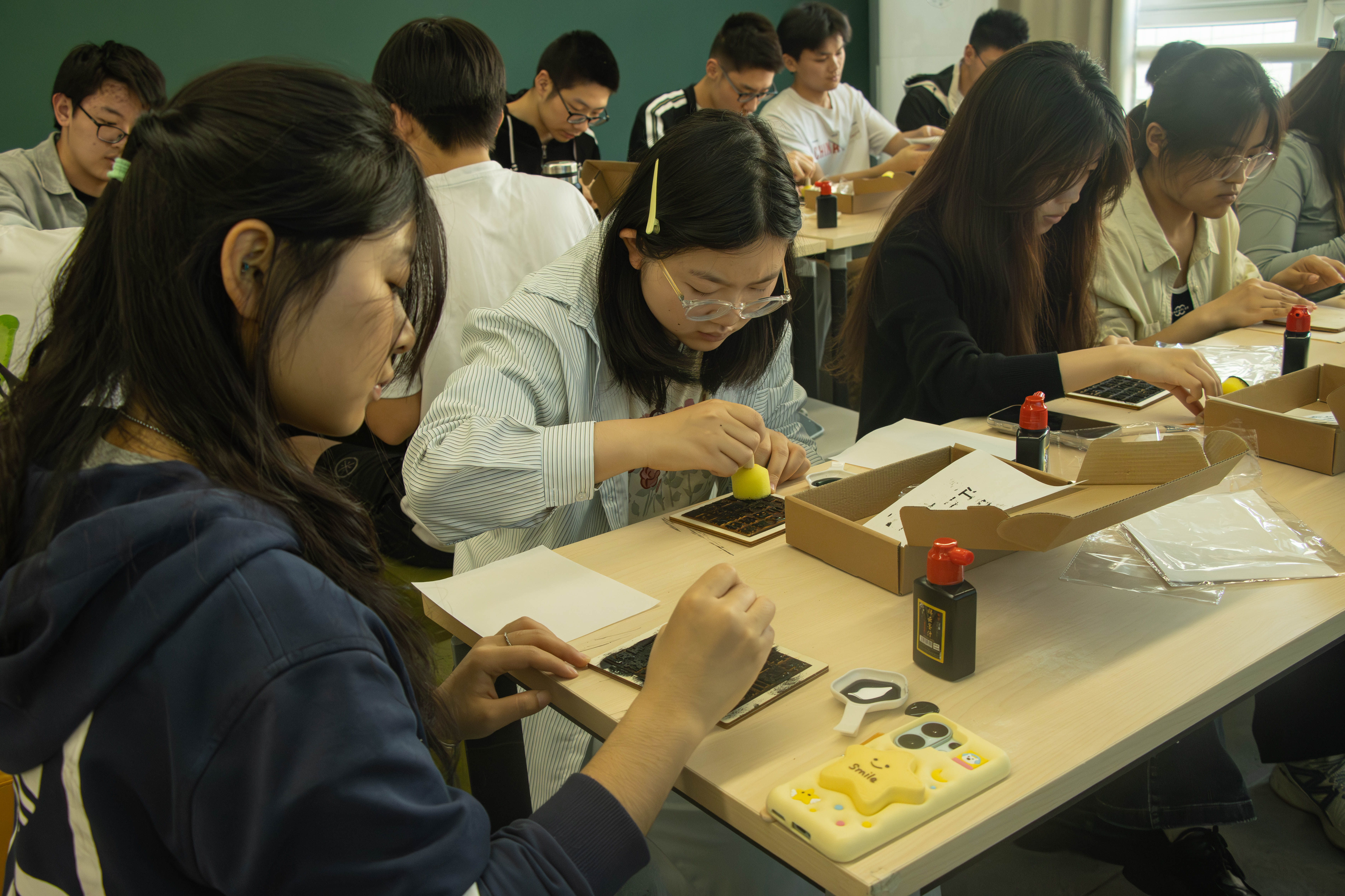 活动开始前,“青苹润心”读书小组负责人向大家介绍本次手工拓印的目的和意义。本次活动的核心内容是“拓印一首刻骨铭心的诗”,在简要讲解后,同学们很快沉浸到了拓印的乐趣中。拓印虽然步骤清晰,但也极为考验耐心。同学们在组织方的指导下,体验了调墨、覆纸、捶拓等关键传统工序。在这一“慢节奏”的传统手工体验中,同学们暂时抛开了繁重的课业压力。一个个古朴、端庄的文字在墨色中跃然纸上,散发出浓郁的书香气。活动结束后,许多同学表示,这次手工体验不仅让他们亲手“触摸”到了古老的文明印记,更是在专注于每一次墨色晕染的过程中,感受到了前所未有的放松。