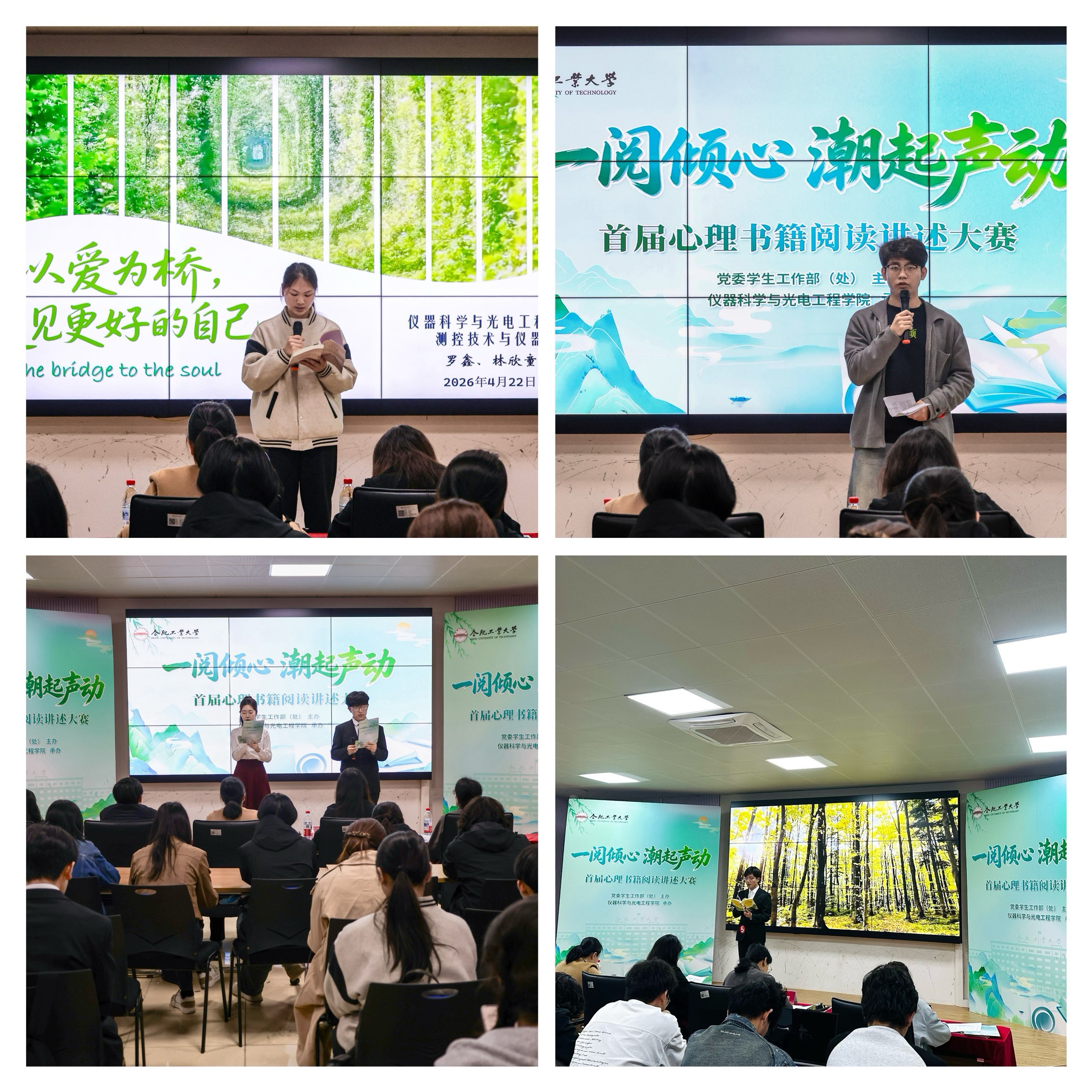 4月22日,在第31个世界读书日来临之际,学校首届“一阅倾心,潮起声动”心理书籍阅读讲述大赛决赛在翡翠湖校区综合楼多功能厅举行。本次大赛由党委学生工作部主办、仪器科学与光电工程学院承办,旨在以阅读滋养心灵,深化心理健康教育,提升学生心理调适能力。