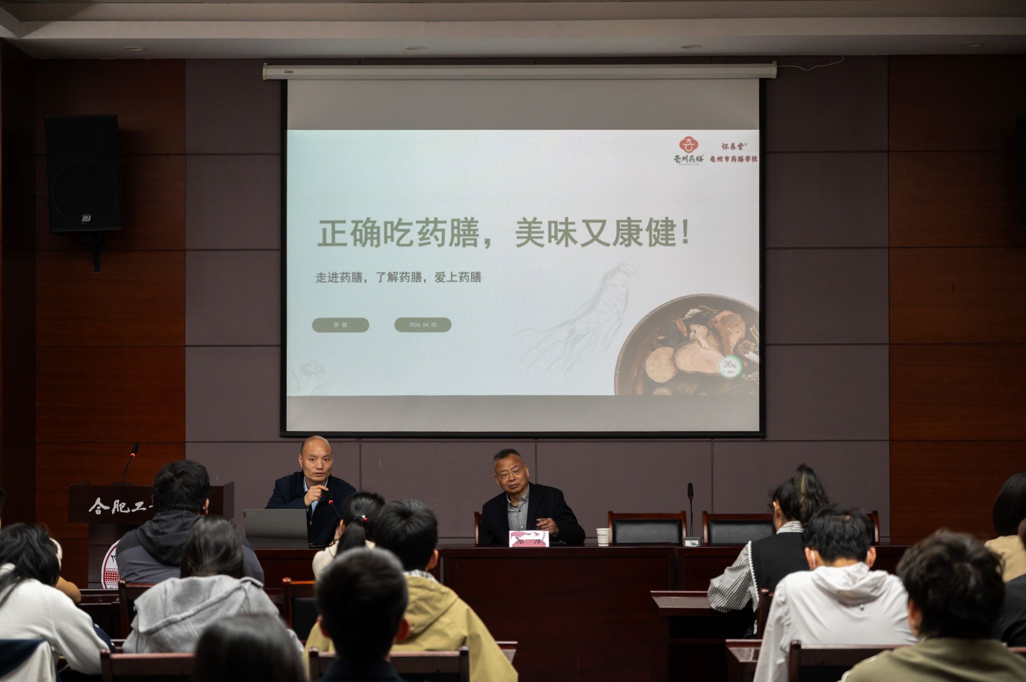 首场报告由怀凯主讲,主题为《正确吃药膳,美味又康健》。怀凯现任亳州市药膳学校校长、亳州药膳产业学院执行院长,是“药膳制作师”国家职业标准第一起草人、国家首位药膳制作师高级技师,同时也是安徽省非物质文化遗产“百年怀养堂药膳制作技艺”代表性传承人。他打破“药膳苦涩难咽”的认知误区,明确“先膳后药”核心理念,系统介绍药膳的定义、分类及食用原则,结合中医九种体质推荐调理方案,展示多种药膳呈现形态,让学子学会科学食用药膳,同时分享安徽省药膳产业发展方向,为同学们提供职业指引。