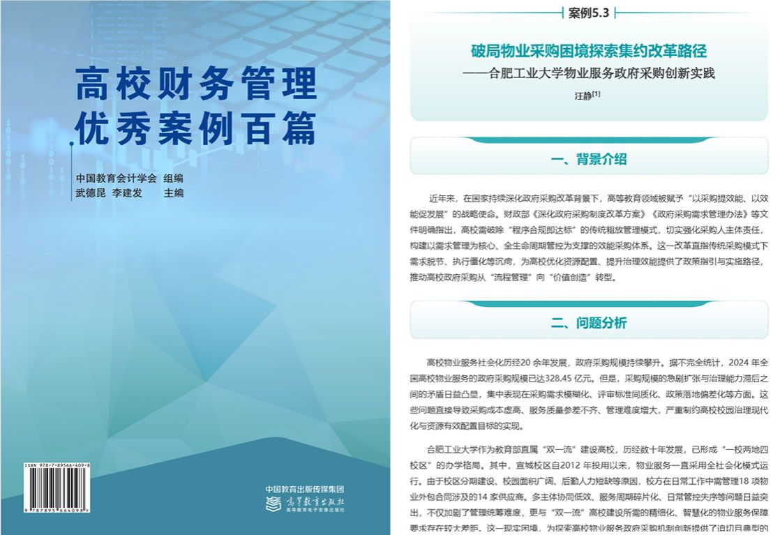 近日,由中国教育会计学会组织评选、高等教育出版社出版的《高校财务管理优秀案例百篇》正式发布。招标采购管理中心副主任汪静撰写的《破局物业采...