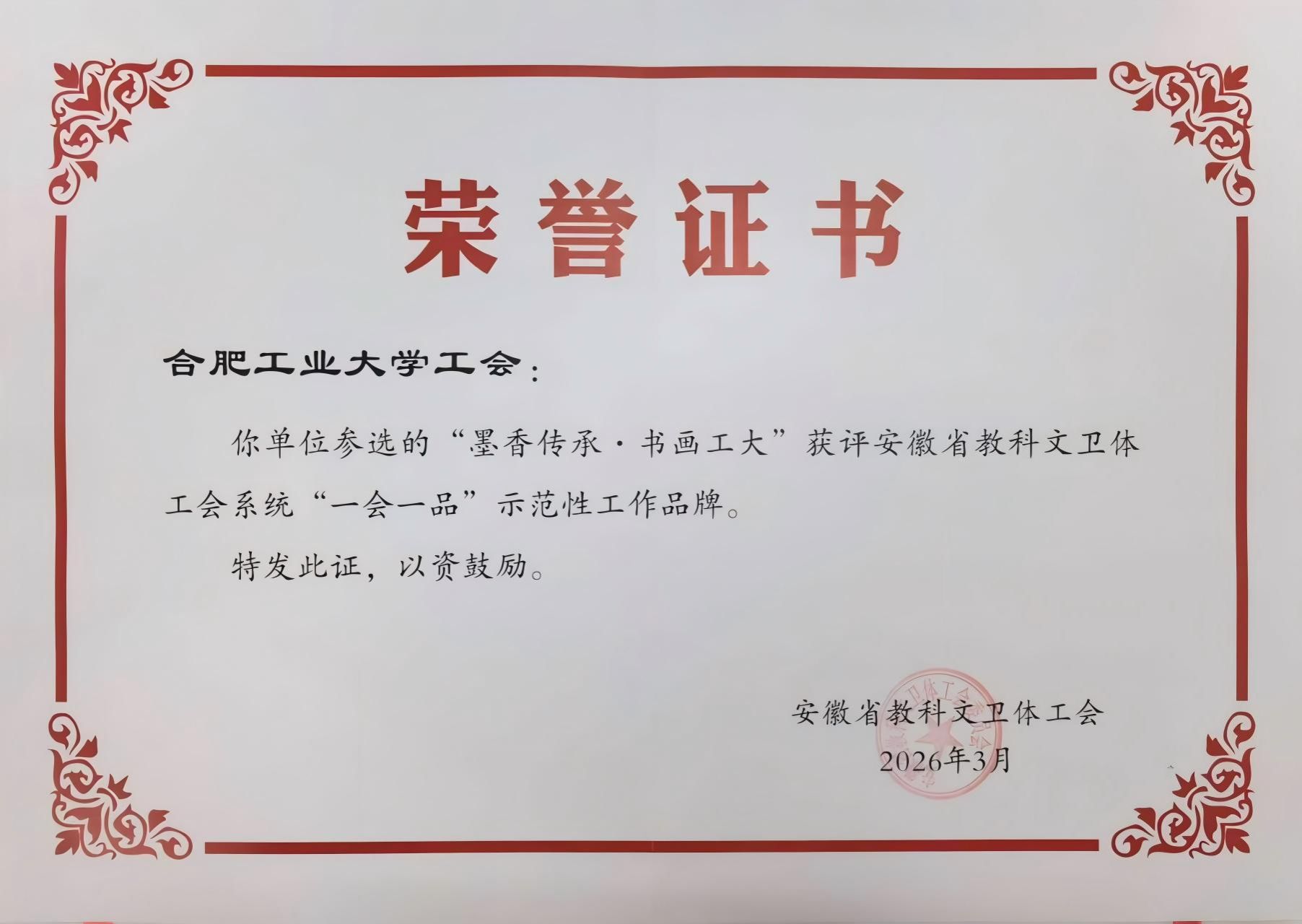 近日,安徽省教科文卫体工会公布首批“一会一品”示范性工作品牌名单,我校“墨香传承·书画工大”工作品牌成功入选。全省仅8家单位获此殊荣。