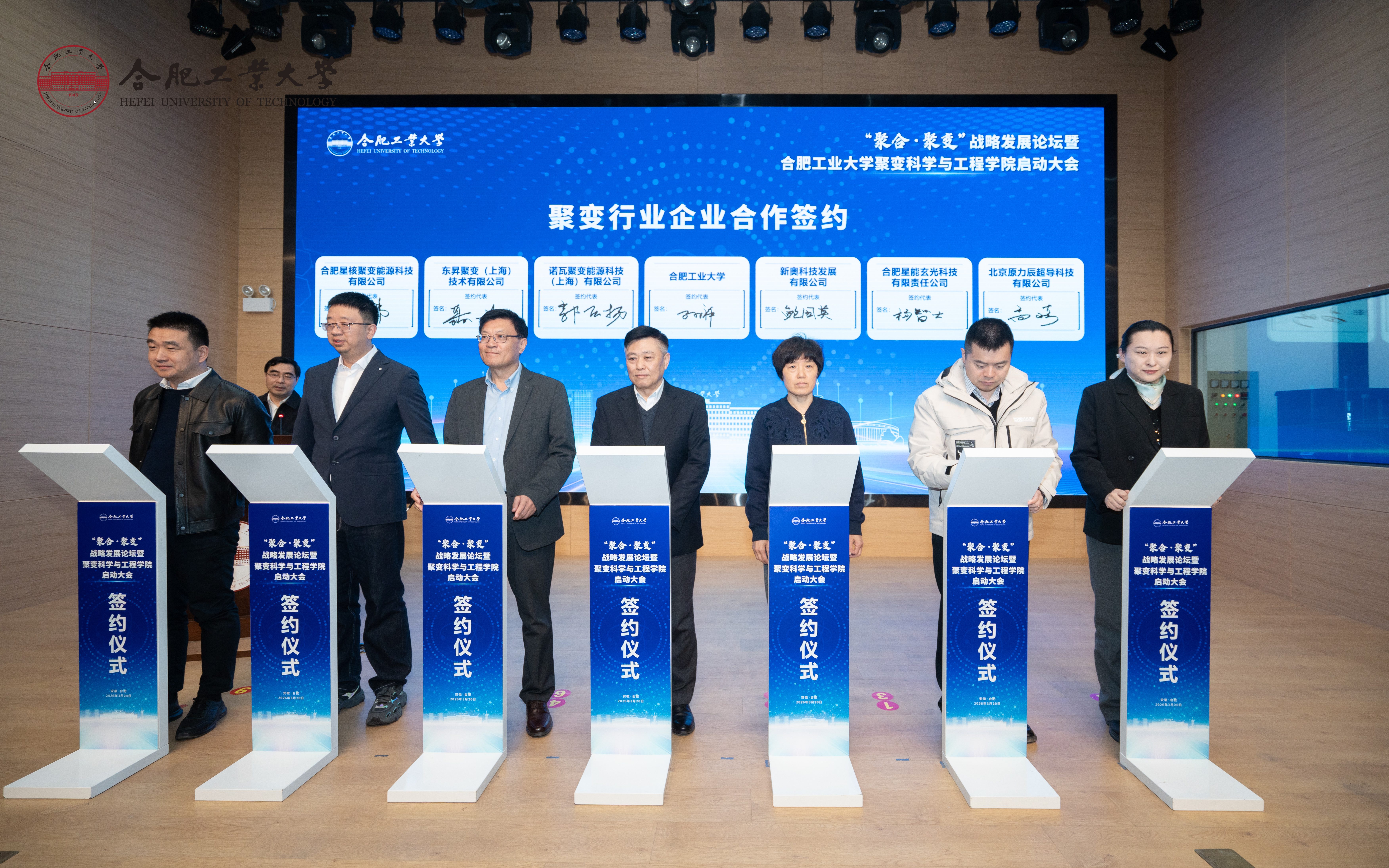 3月20日上午,“聚合·聚变”战略发展论坛暨合肥工业大学聚变科学与工程学院启动大会在学校屯溪路校区举行。安徽省科学技术厅、合肥市人民政府、中国科学院合肥物质科学研究院、合肥综合性国家科学中心能源研究院、聚变新能(安徽)有限公司、长丰县人民政府等单位负责人,李建刚研究员等战略咨询委员会成员,校党委书记于祥成,校长汪萌出席大会。大会由校党委常委、副校长徐宝才主持。会上,聚变科学与工程学院正式启动建设,并举行了一系列合作签约、联合实验室揭牌及战略咨询委员会聘任仪式。