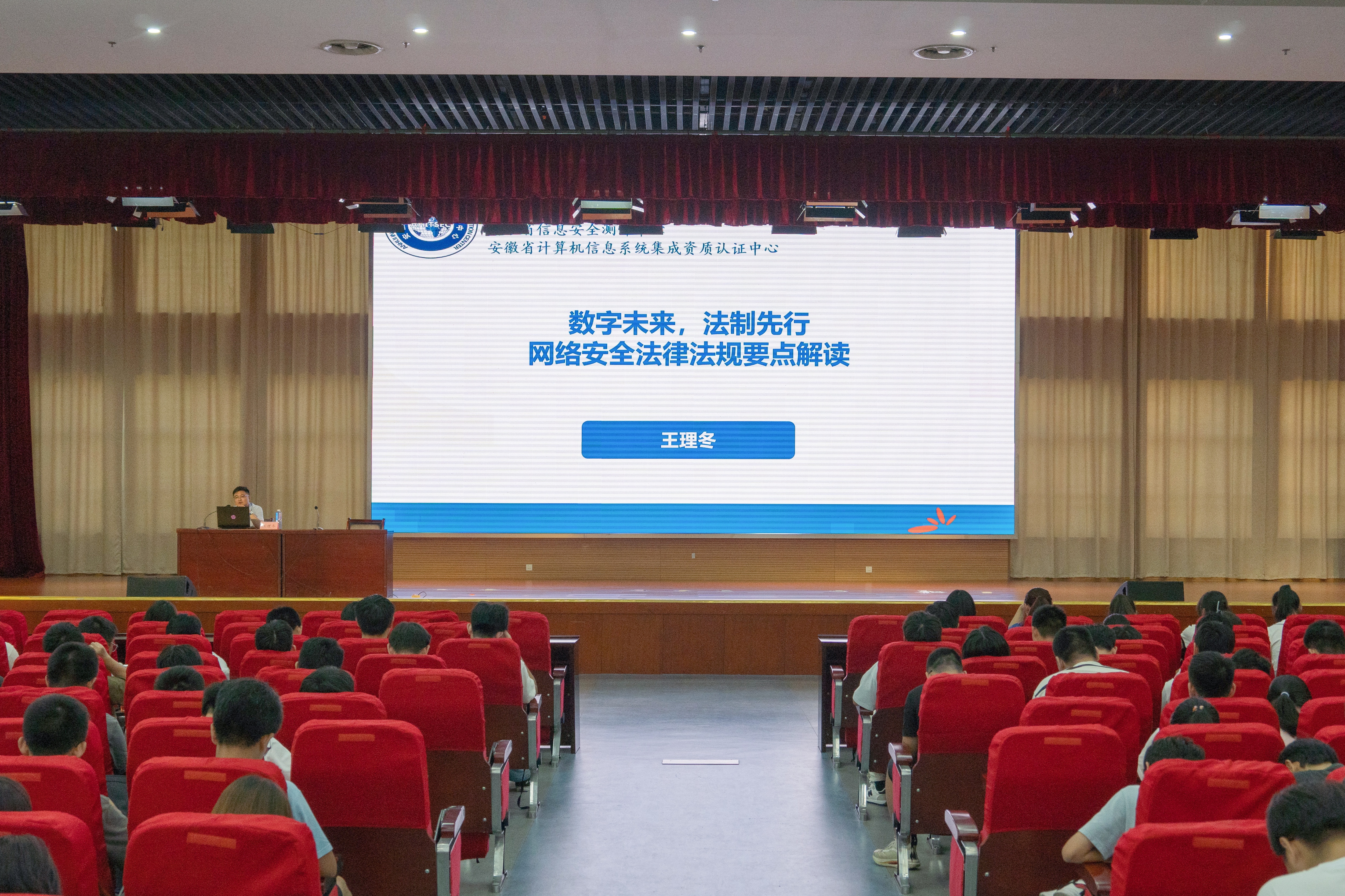 提升学生的法治素养与网络安全防护能力。邀请安徽省工信厅电子产品监督检验所(安徽省信息安全测评中心)王理冬作“数字未来,法制先行:网络安全法律法规要点解读”主题报告,系统介绍我国网络安全法律法规体系,深入解读《网络安全法》《数据安全法》《个人信息保护法》《密码法》等多部法律的核心内容,呼吁同学们重视国家网络安全,共建网络文明,共享网络安全。