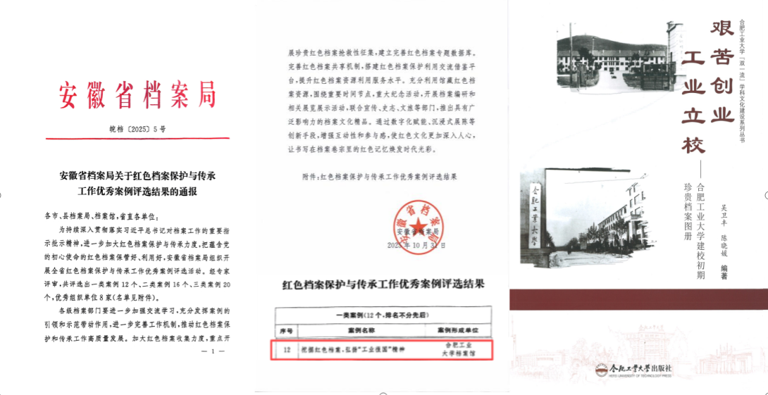 近日,安徽省档案局发布《关于红色档案保护与传承工作优秀案例评选结果的通报》,经专家评审,全省共评选出一类案例12个、二类案例16个和三类案例20个,其中,我校档案馆申报的《挖掘红色档案弘扬“工业报国”精神》被评选为一类案例,这也是学校档案编研成果首次获评省级一类案例。