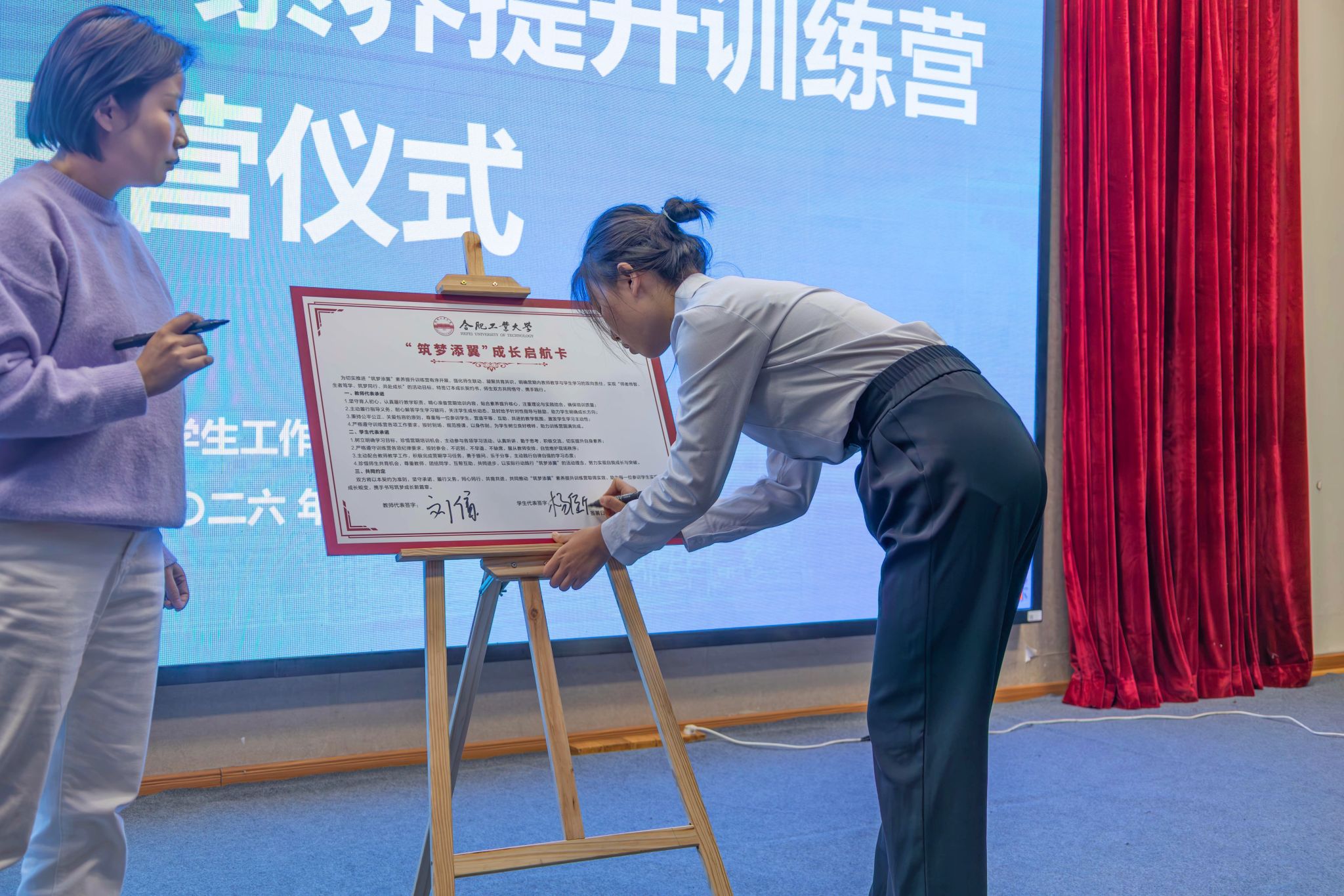 仪式上,党委学生工作部副部长邹佳莹介绍了训练营的筹备情况、课程体系与育人目标。学生资助服务中心主任李茂茂宣读了训练营纪律要求。时光体育培训事务部负责人陆唯、电气与自动化工程学院杨佳欣分别作为授课方代表、营员代表发言,教师代表刘倩与学员共同签署“成长约定・共筑新程”培训启航卡。