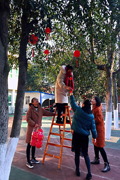 在活动前夕,教师为孩子们营造出新年初始的欢乐氛围,红红的灯笼高高挂,串接起了长龙在园中排列开来;快乐的小雪人、可爱的气球、大大的礼物盒、闪亮的雪花装饰在园内的每一个角落,显得格外喜庆。教师还精心准备了好玩的游戏材料,有霸王龙的红果子、小小的足球、爸爸的格子衬衫、蚂蚁们的大西瓜、云朵形状的面包、彩色的花和被吞掉的苹果树,这些都来自孩子们极为喜爱的经典绘本元素。