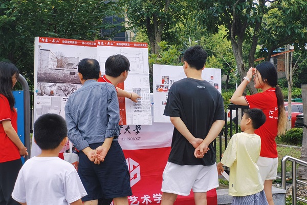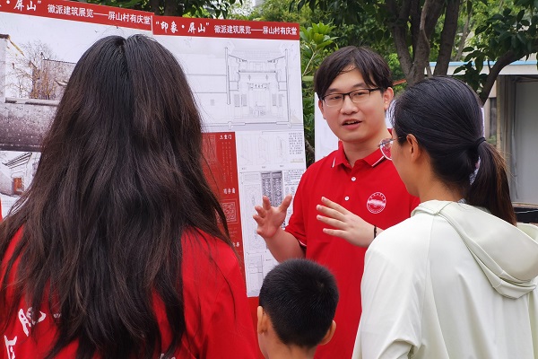 7月18日,团队从黄山市返回合肥市进行线下宣传,向群众们展示屏山村的美丽,介绍古建筑的风采。“屏山村的舒光裕堂有着徽州独一无二的五彩九檐门楼,这是因为进士舒荣都因弹劾魏忠贤而被陷害,平反昭雪后,皇帝恩准祠堂门楼可为最高等级的五彩九檐形式。”团队队员讲解道。“原来是这样啊,真是精妙绝伦!”一名带着小孩的家长在听完队员们介绍后感叹道。
