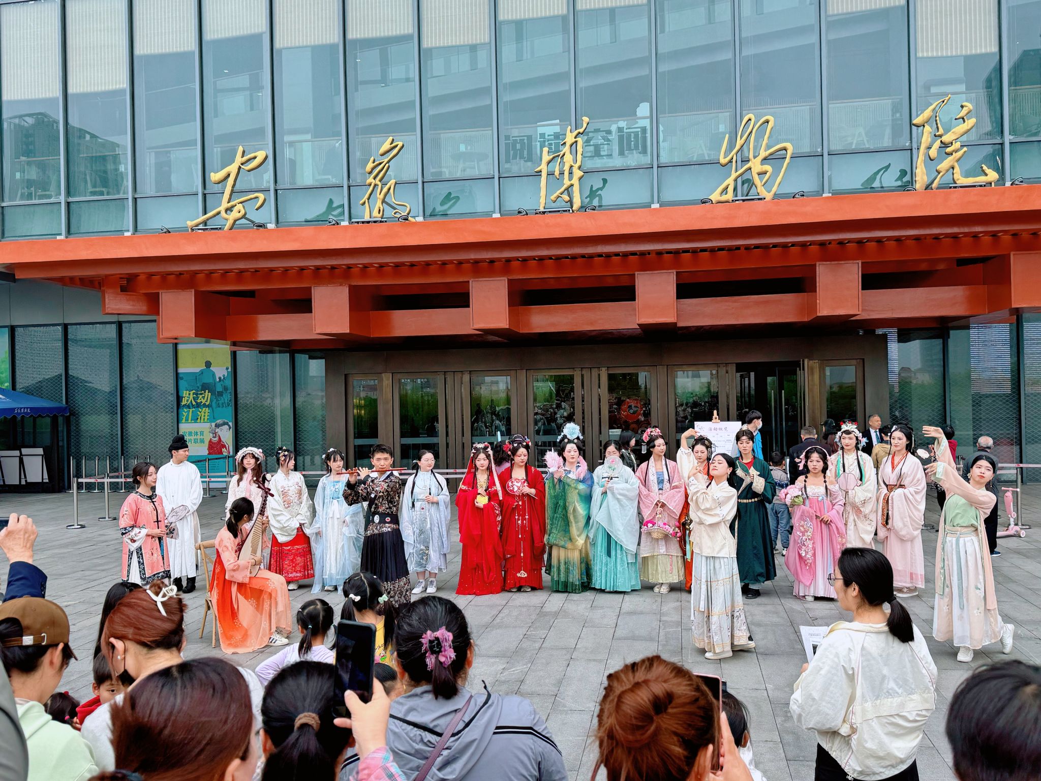 活动期间,“丽人行”小组同学随着安徽博物院十二“花神”游园队伍,接连在玉壁广场和东门广场表演了国风节目《兰亭序》。在一段诗文诵读开场后,悠扬的竹笛声与清脆的琵琶声互相交织,与轻柔的古典舞融为一体,令现场的观众沉浸其中,纷纷拿出手机摄影记录。