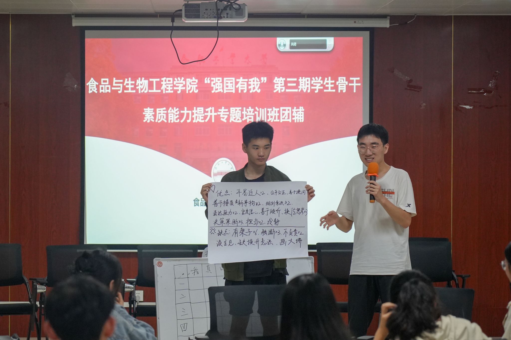 食品与生物工程学院高度重视学生干部队伍建设和管理,“强国有我”学生骨干素质能力提升培训班已成功开办三期,通过主题授课、团体辅导和实践锻炼相结合的方式,引导广大学生干部“立大志、明大德、成大才、担大任”,将小我融入大我,将青春献给祖国。