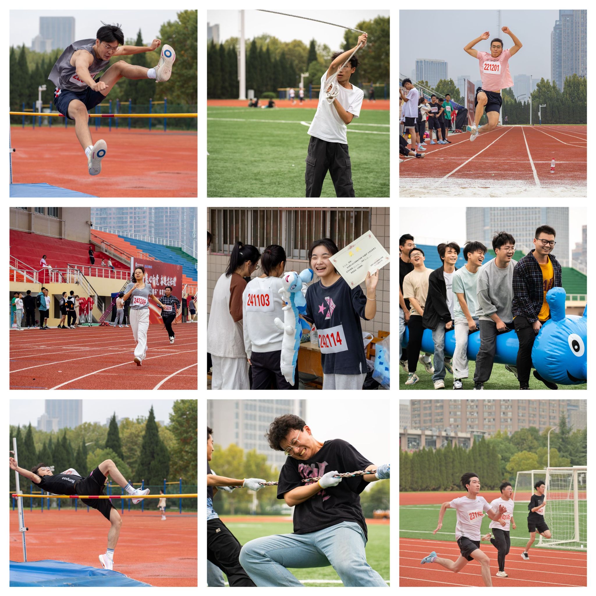 本次体育文化节设置了校运会选拔类项目和趣味项目,涵盖了短跑、长跑、跳远等多项比赛。尽管当天下起了蒙蒙细雨,但丝毫不能抵挡同学们的热情。绿茵场上运动员们奋力拼搏,不断挑战自我。田径项目中,选手们如离弦之箭,全力冲刺;跳远项目中,运动员的腾空宛如一只蓄力待发的弹簧,带着坚定的眼神和勇往直前的决心,展示出惊人的控制力;集体项目比赛中,每个班级的同学都大显身手,默契配合。