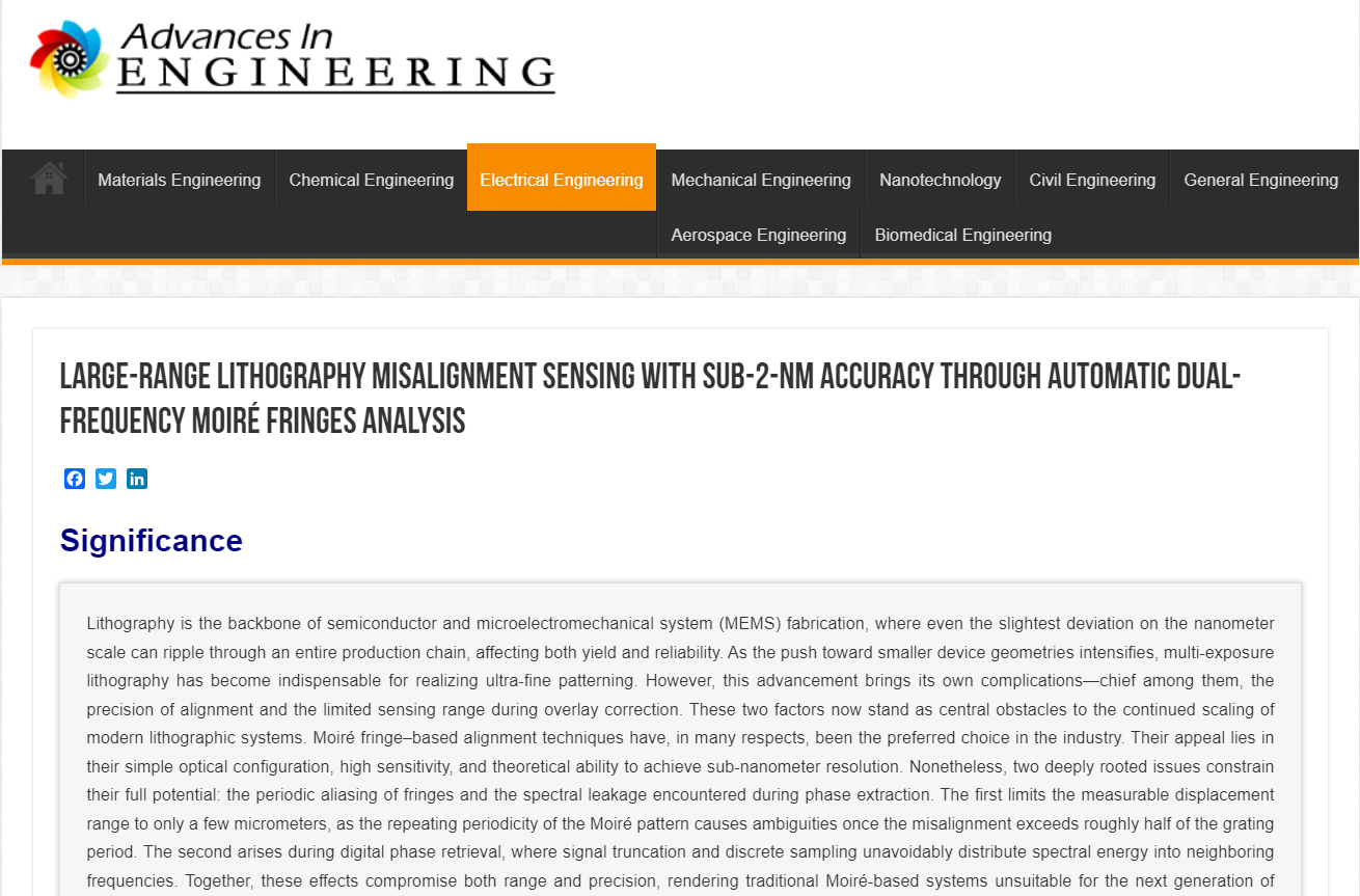 Advances in Engineering(AIE)报道原文链接:https://advanceseng.com/large-range-lithography-misalignment-sensing-sub-2-nm-accuracy-automatic-dual-frequency-moire-fringes-analysis/