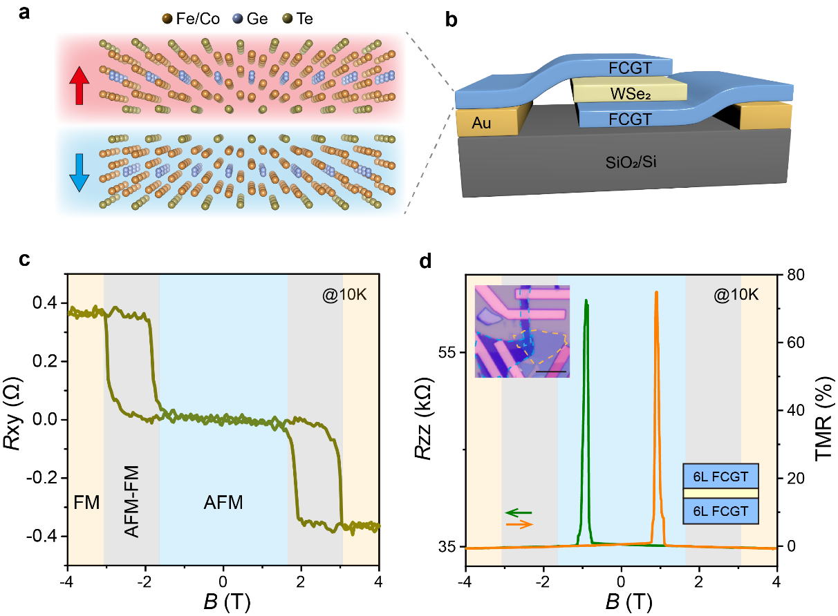 图: a. A型反铁磁FCGT示意图;b. FCGT/WSe₂/FCGT反铁磁隧道结示意图;c. 6层FCGT在10 K温度下,对称霍尔电阻Rxy随垂直磁场的变化关系;d. FCGT/WSe₂/FCGT反铁磁隧道结的隧穿电阻Rzz及对应的TMR比值。