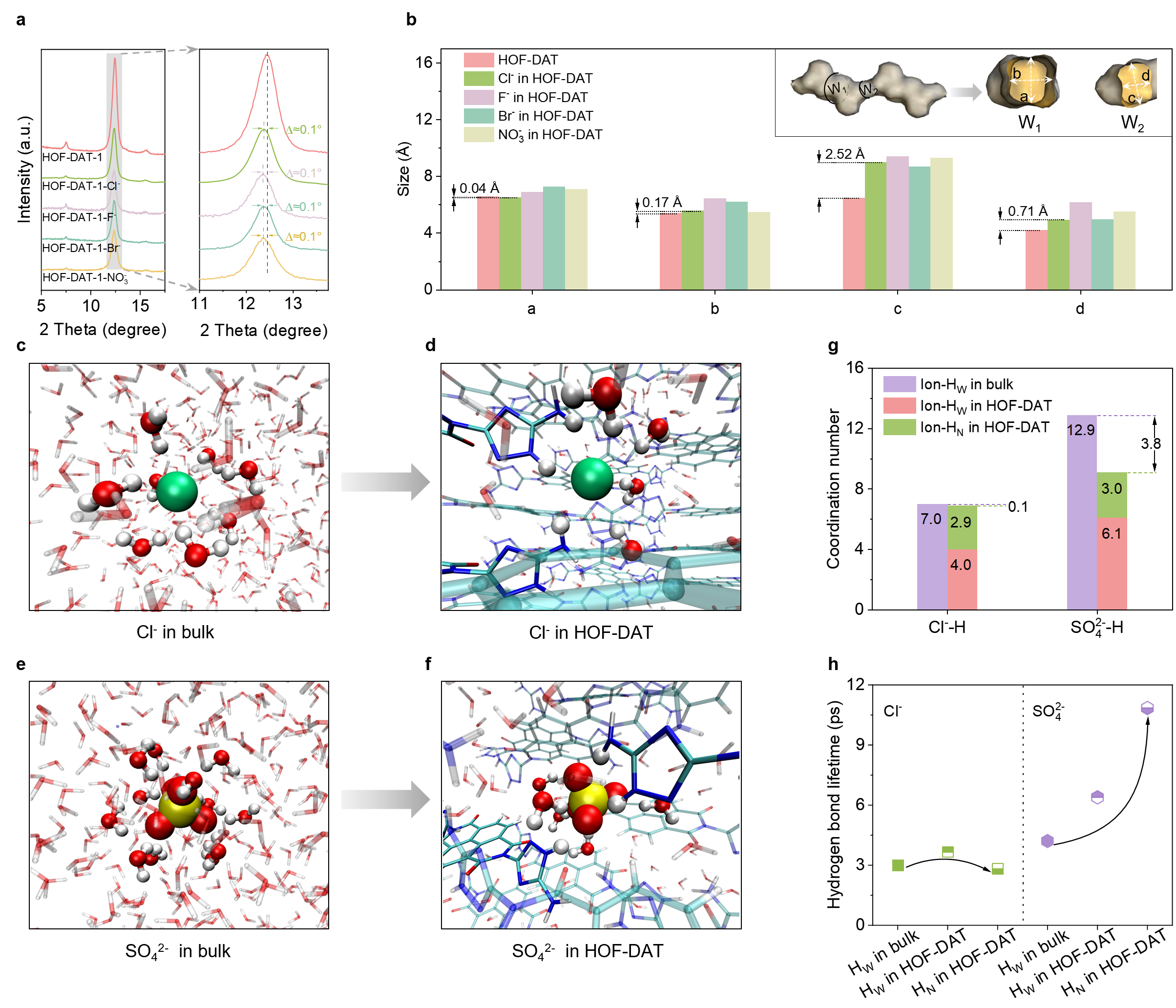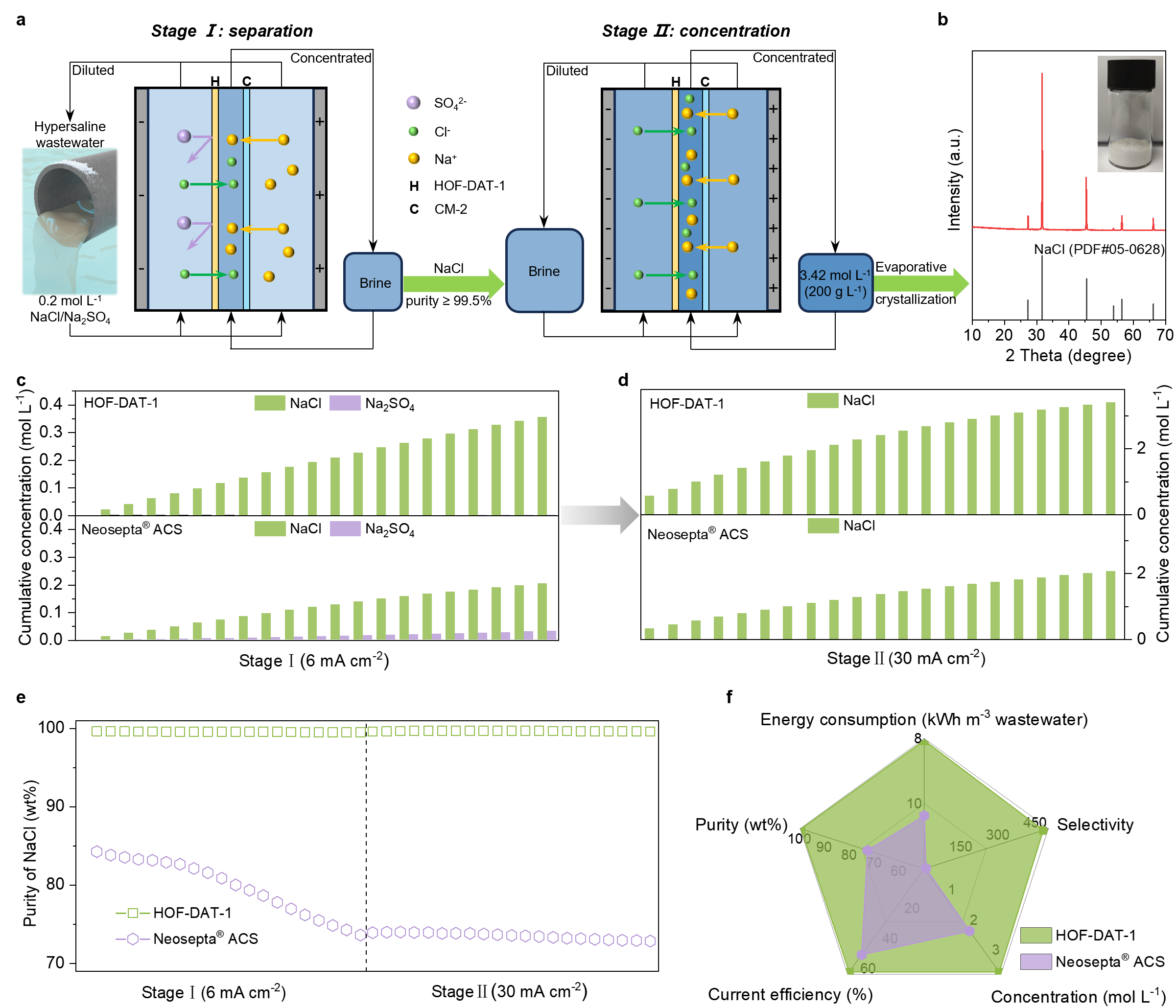 针对上述挑战,研究团队提出一种仿生设计策略,通过在HOF膜中构建类似CLC氯离子过滤器的超微孔道结构,实现对阴离子的尺寸筛分和能量补偿。该孔道不仅具有对Cl⁻的适应性尺寸,还引入了氢键供体以提供“低粘度”补偿作用,有效降低离子脱水过程中的能量损失。借助Cl⁻与较大阴离子(如SO₄²⁻)在脱水和能量补偿方面的差异,该膜实现了Cl⁻/SO₄²⁻选择性超过400,比现有同类膜高出数十倍;同时Cl⁻渗透速率是商用Neosepta® ACS膜的两倍。在处理高盐废水的电渗析应用中,该膜实现了更高的NaCl产品纯度(99.62 wt%对比72.86 wt%)且能耗比Neosepta® ACS膜低28.7%。这一研究不仅展现了氢键有机框架作为人工离子通道构建平台的潜力,也通过仿生微环境工程设计,为新一代分离膜的开发提供了重要范式。