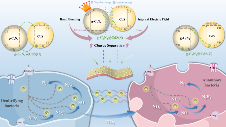 近日,土木与水利工程学院王伟教授团队在低碳比污水脱氮领域取得新研究进展,相关研究成果以“Regulation of photogenerated electron transfer efficiency: Heterojunction enhanced photocatalysis coupled with anaerobic ammonium oxidation for nitrogen removal”为题,在自然指数(Nature Index)期刊《Water Research》在线发表。