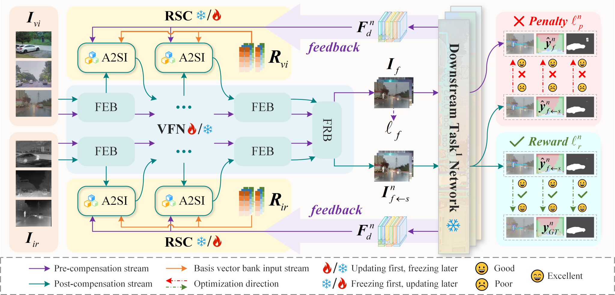 针对单一融合网络难以同时适应多个下游任务的问题,团队提出了一种基于闭环动态优化机制的多任务感知图像融合方法(如图1所示),能够让融合网络在不重新训练的情况下自适应地响应不同下游任务的语义需求,实现对多样化下游任务的动态感知。具体而言,设计了一种闭环动态网络,在融合网络(VFN)、需求驱动的语义补偿(RSC)模块以及多个下游任务网络(DTN)之间构建了一条语义传输链。通过这条语义传输链,RSC模块能够接收来自不同下游任务网络反馈的语义特征,并据此对融合网络动态施加任务特定的语义补偿,从而提升融合网络的多任务适应能力。为实现准确的语义补偿,闭环优化机制中引入了奖励惩罚策略,通过比较语义补偿前后的下游任务性能,对RSC模块进行适时地奖励或惩罚,使其逐渐习得对多样化任务语义需求的自适应响应能力。