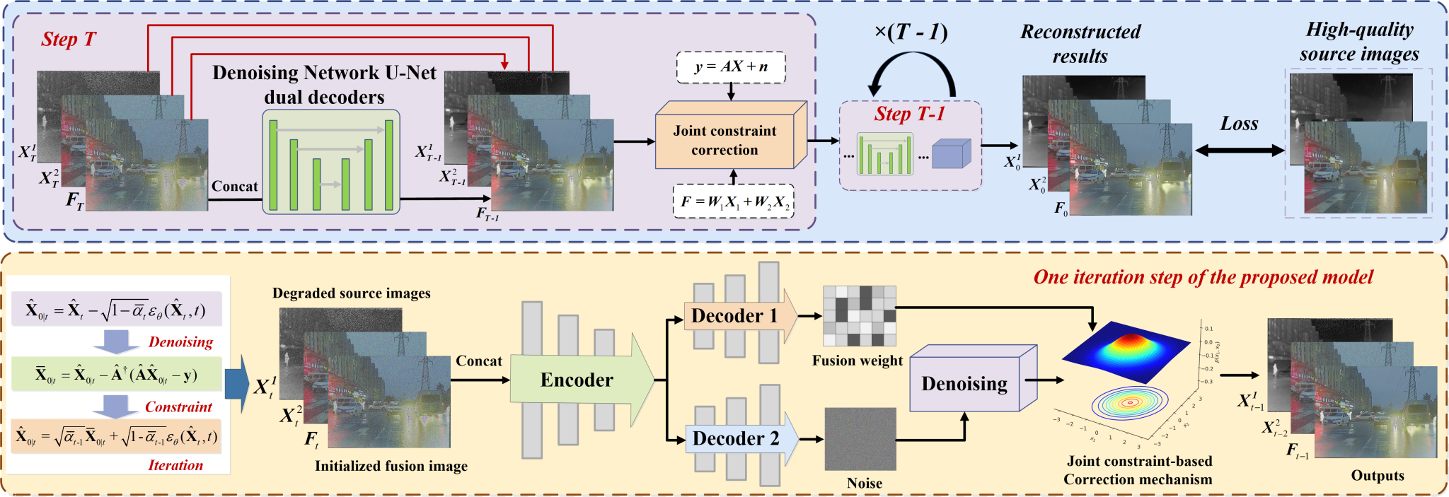 针对噪声、模糊、低分辨率等各类退化场景下的多模态图像融合问题,团队提出了一种基于DDIM的复原和融合联合建模框架(如图2所示),通过联合观测校正机制对扩散模型的中间输出施加复原和融合双重约束,提升退化条件下的融合质量。该方法从统一退化模型出发,将不同模态图像的退化过程与融合目标共同纳入同一联合建模方程,在扩散采样过程中交替执行“复原及融合结果预测—联合约束校正—迭代更新”,使生成结果既满足退化观测的一致性要求,又能够自适应整合不同模态的互补信息。与此同时,该方法通过直接回归融合图像替代传统噪声预测方式,从而能够更灵活地适应不同融合任务,并结合DDIM加速采样策略有效减少扩散步数,在保证结构信息、纹理细节和显著目标保留能力的同时,进一步提升了复杂退化场景下多模态图像融合的效率与鲁棒性。