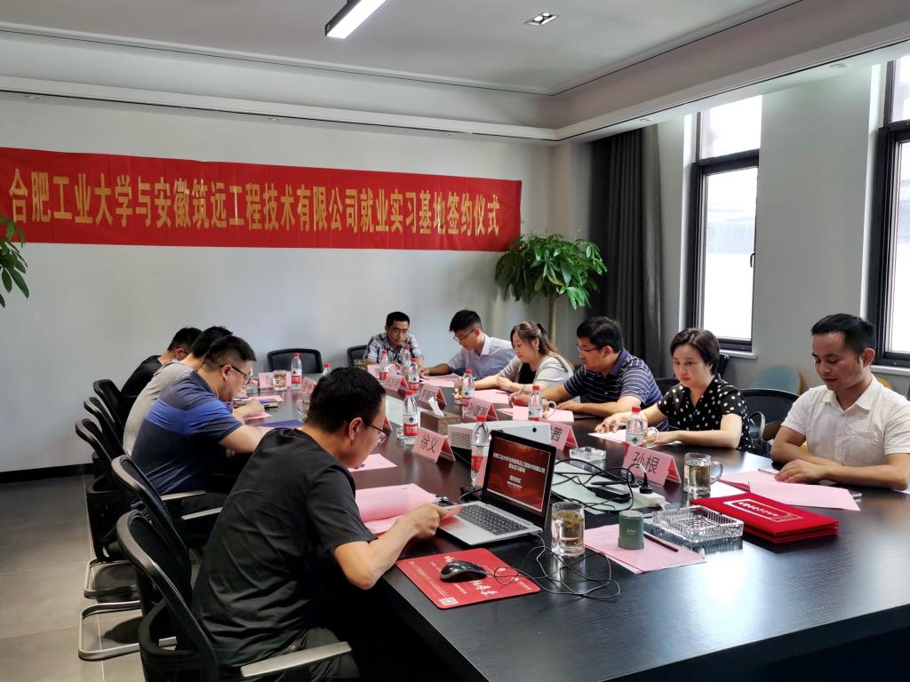 孙建海和安徽筑远工程技术有限公司总经理丁磊共同为“合肥工业大学就业实习基地”揭牌。关茜和韩栋代表校企双方签署《合肥工业大学大学生就业实习基地协议书》。